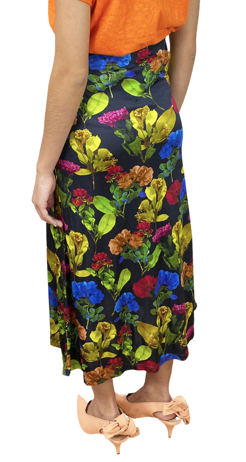 Falda maxi con diseño de flores multicolor y detalle de botones en delantero.