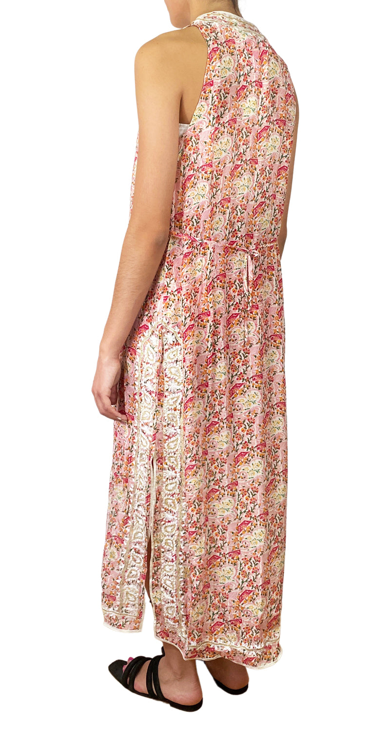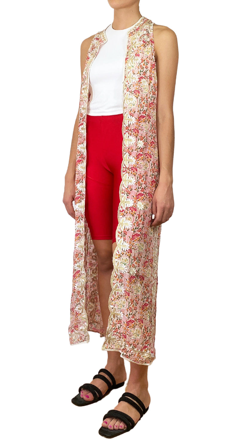 Kimono multicolor con estampado y bordado en ruedo con fibras metalizadas.