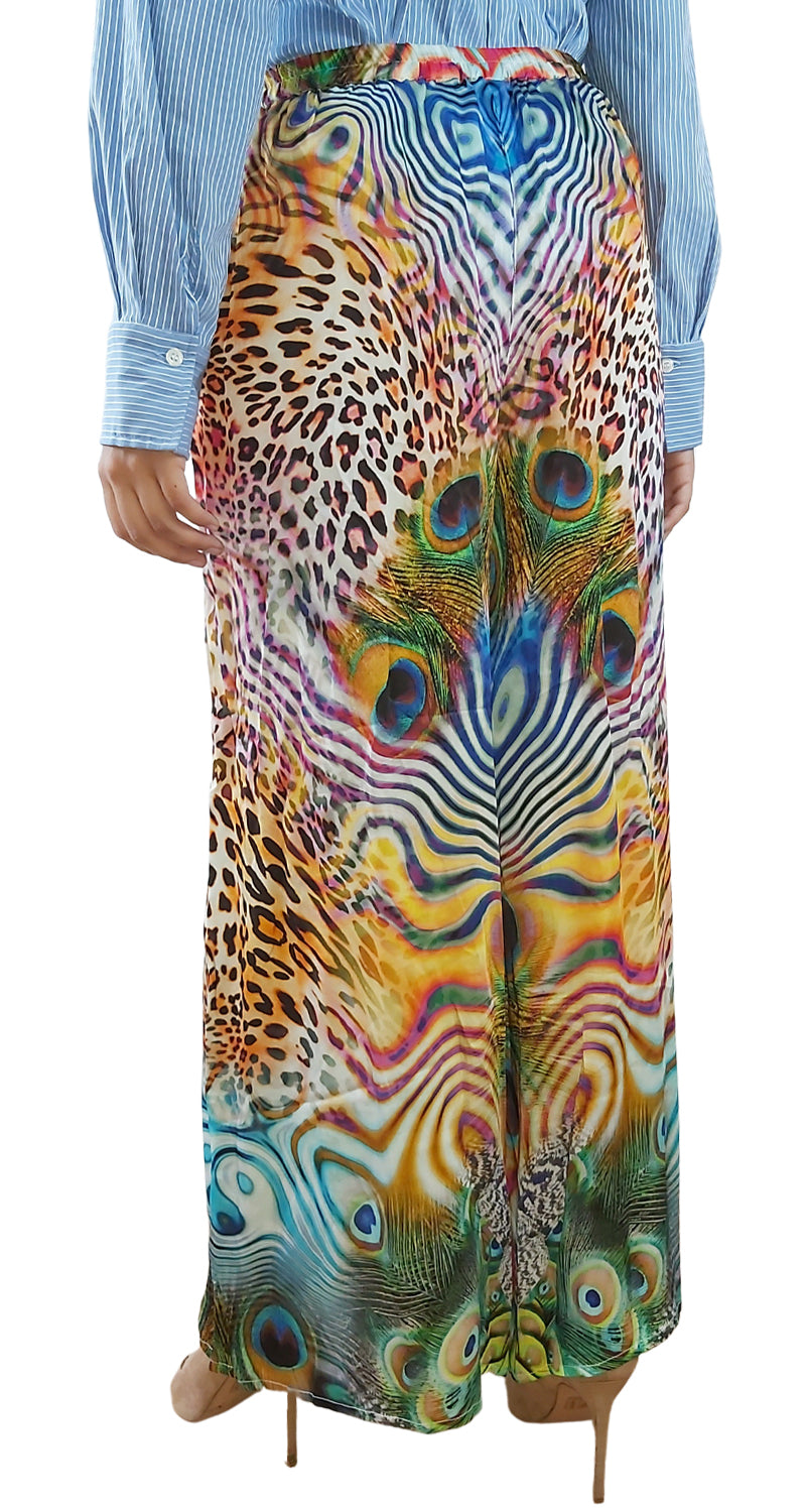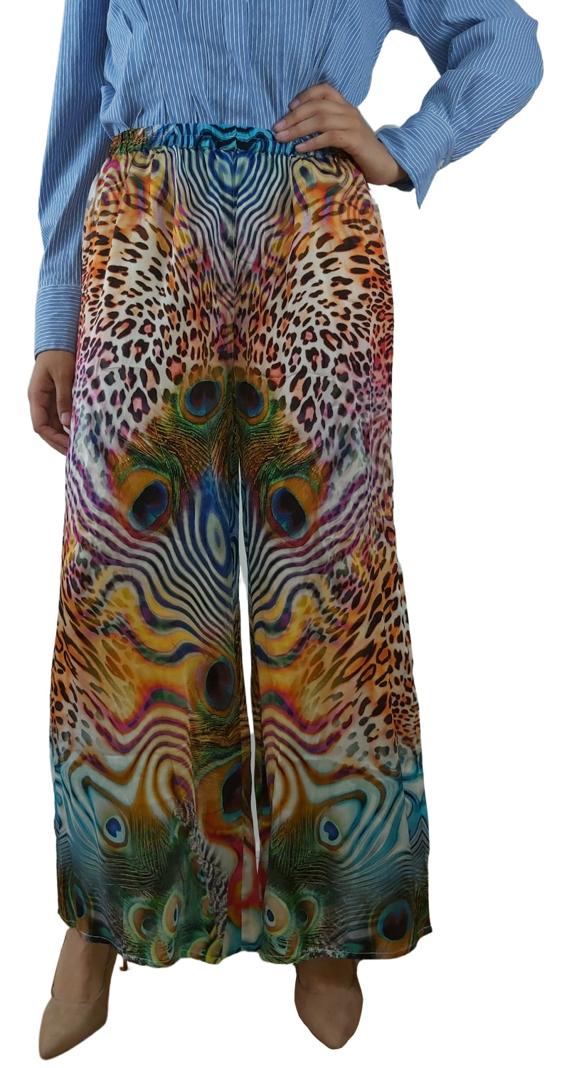 Pantalón ancho con estampado de Pavo Real en delantero y Animal Print Multicolor. Tiene pretina elasticada.
