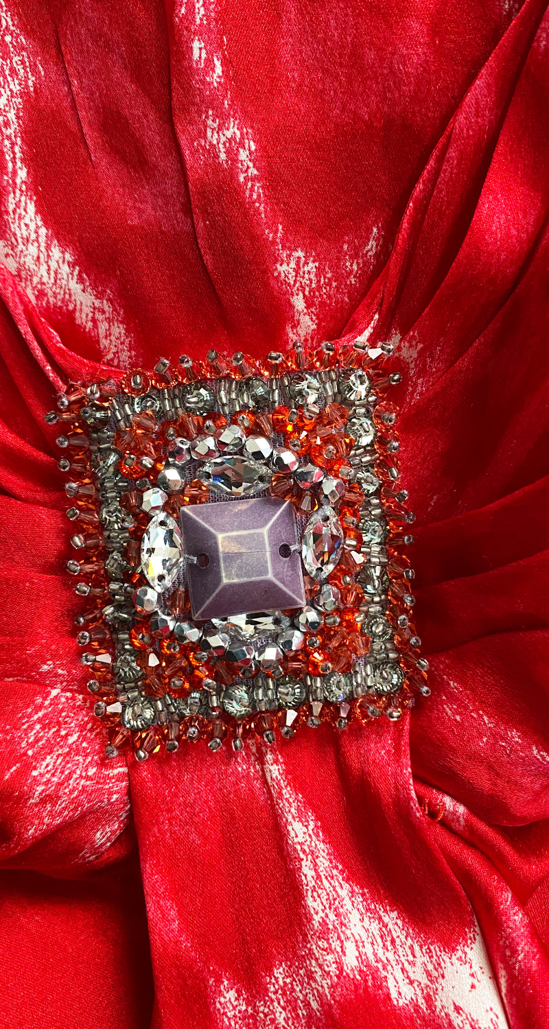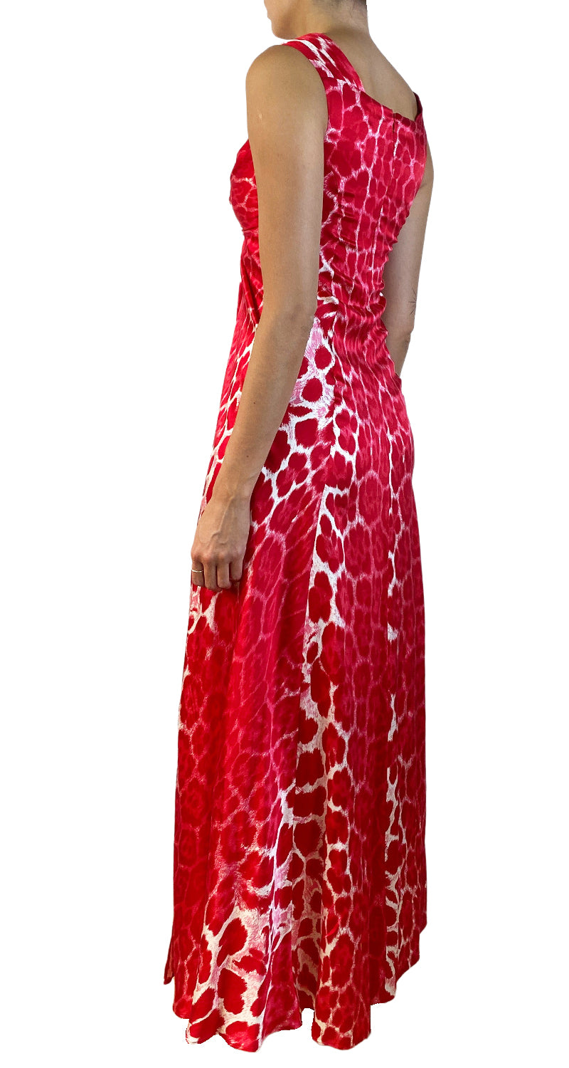 Vestido color Rojo con estampado Animal Print cierre en centro espalda y abertura en falda.
