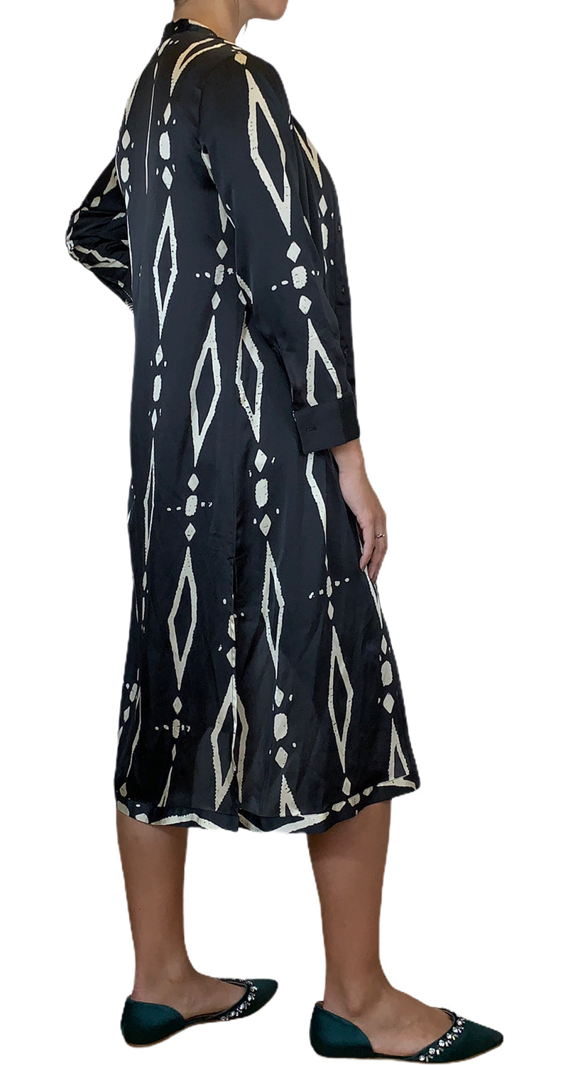 Camisa larga color Negro con diseño étnico en tonos Beige. Cuello mao con broches a presión en tapeta frontal.