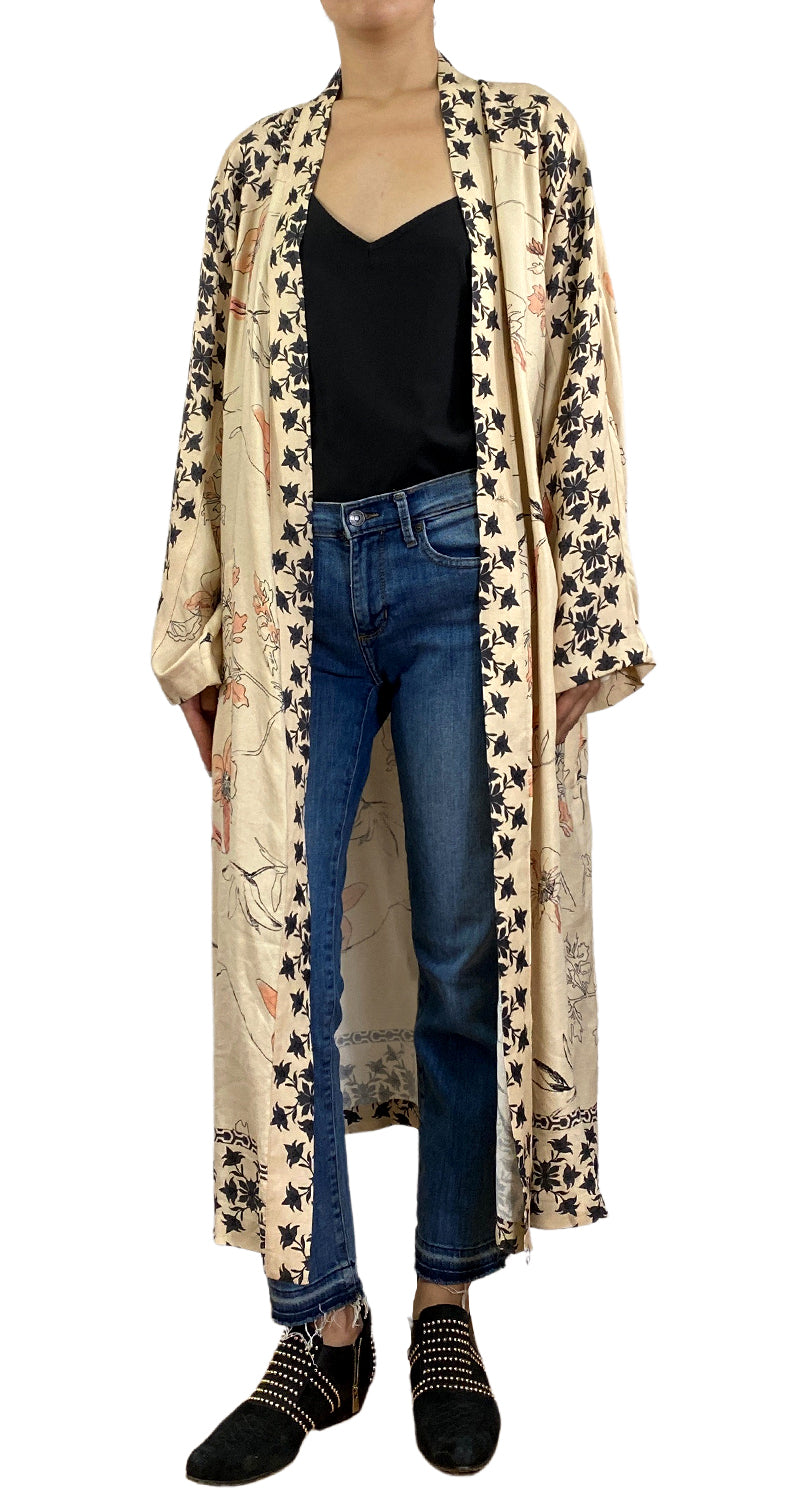 Kimono Beige con diferentes dibujos. Talla S. Altura de modelo 1,68.
