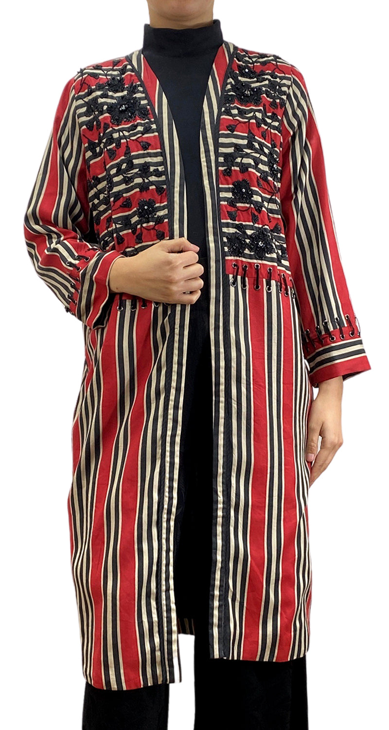 Kimono con diseño de rayas en tonos Rojo, Beige y Negro, bordado y detalle de mostacillas.