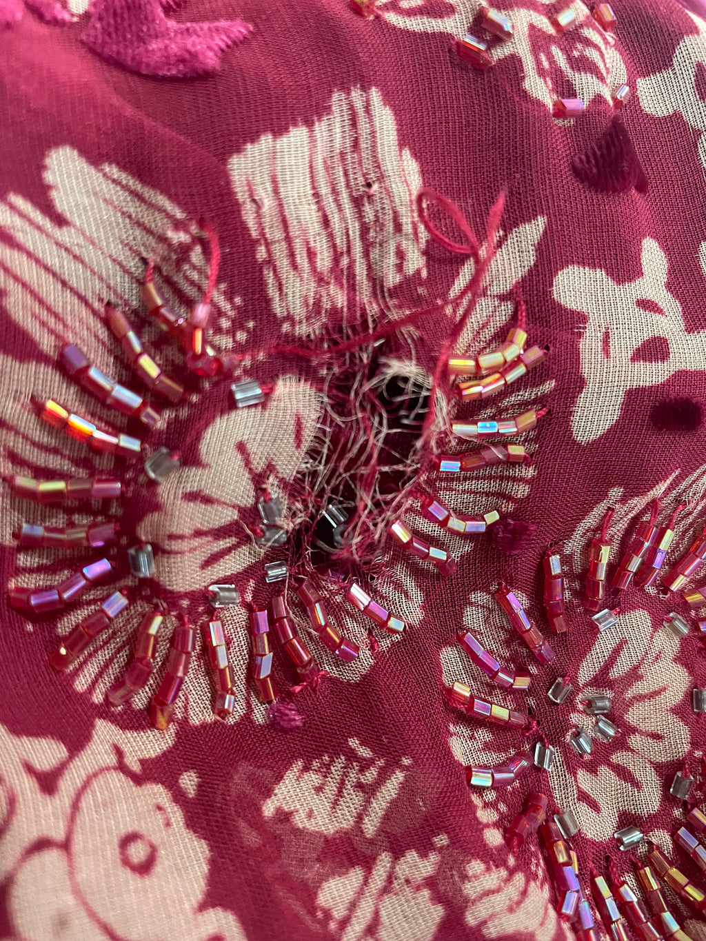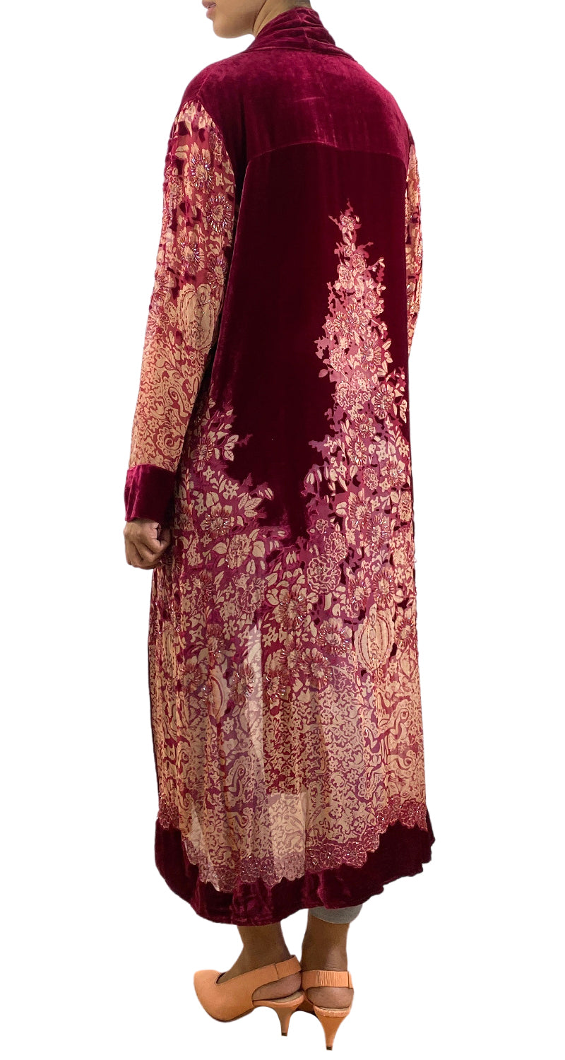 Kimono color Rojo de terciopelo con aplicación de mostacillas. Presenta detalle en manga