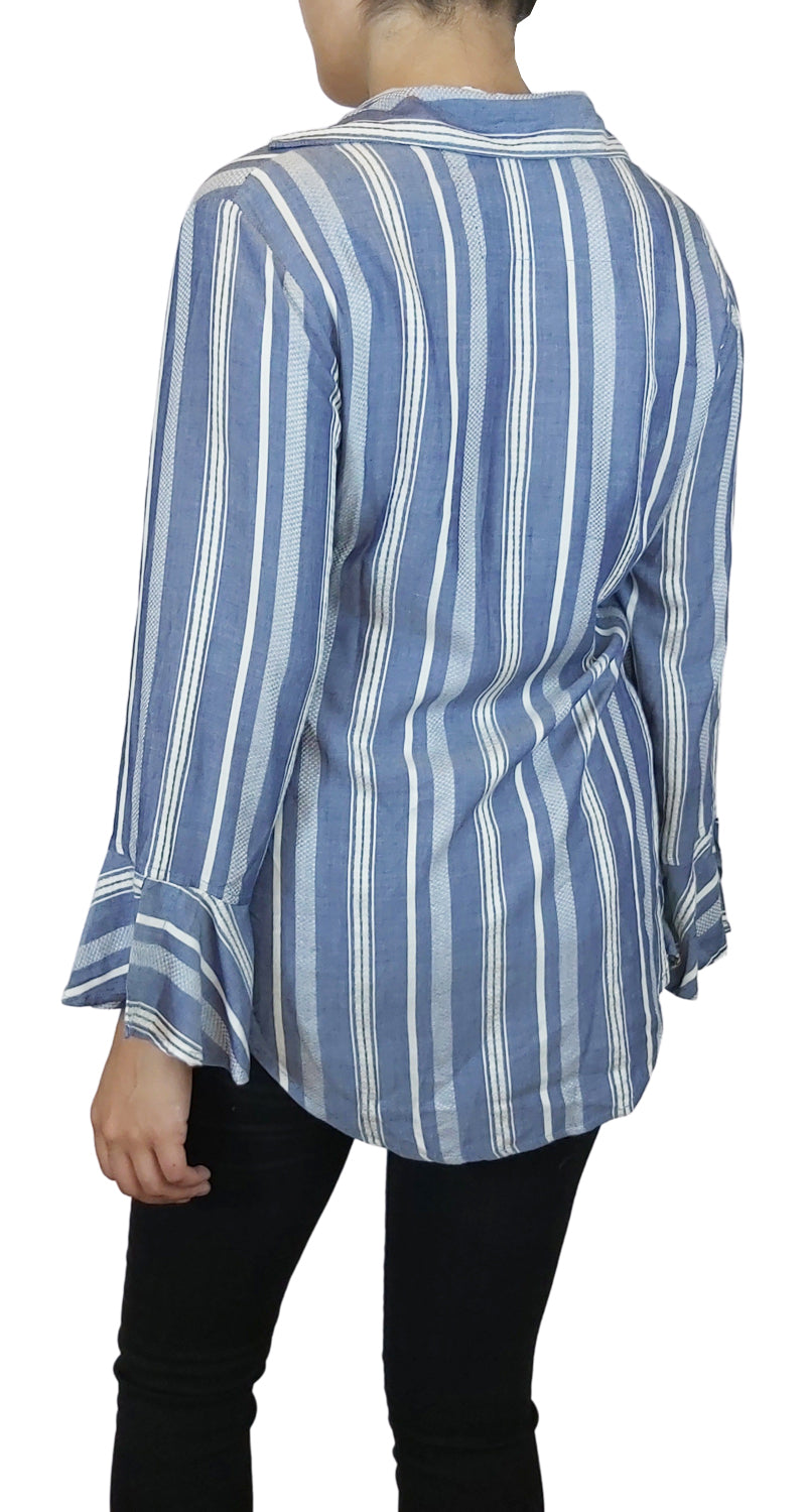 Blusa abotonada a rayas color Azul y Blanco, tiene amplitud en puños de la manga.