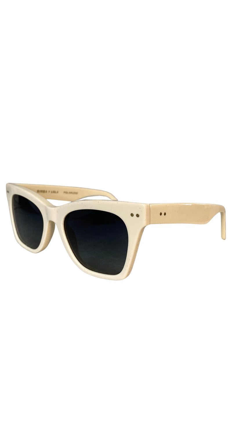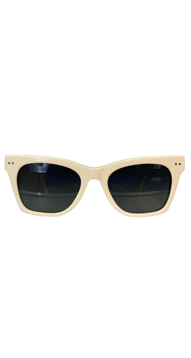 Lentes de sol de forma cuadrada en color Crema. Medidas: lente 5 cm, puente 1cm, varilla 14 cm.
