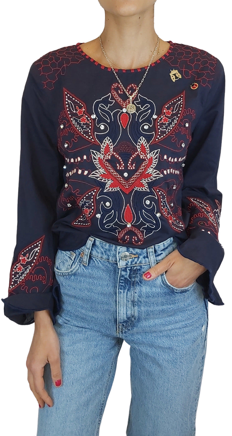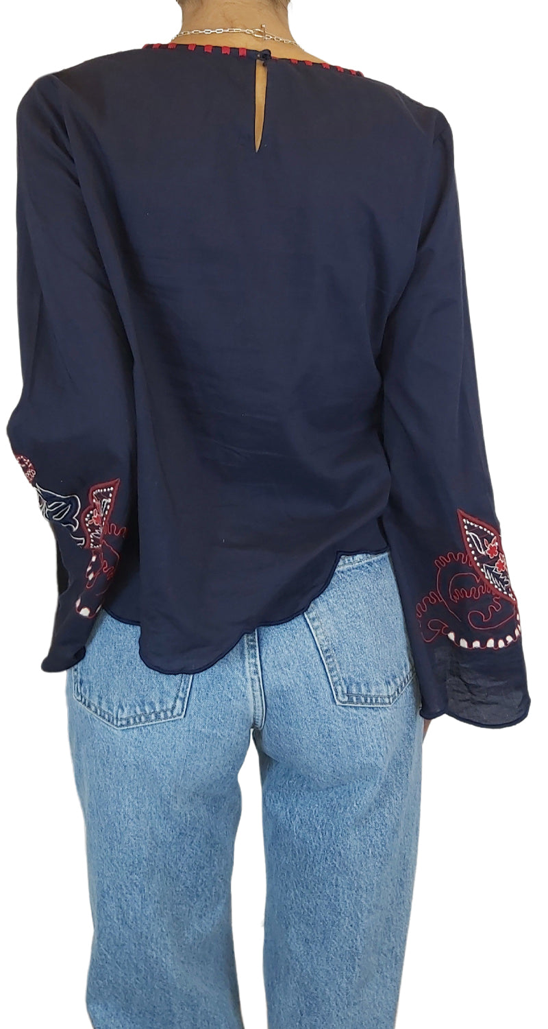 Blusa manga larga color Azul marino con detalles bordados color Rojo y Blanco.