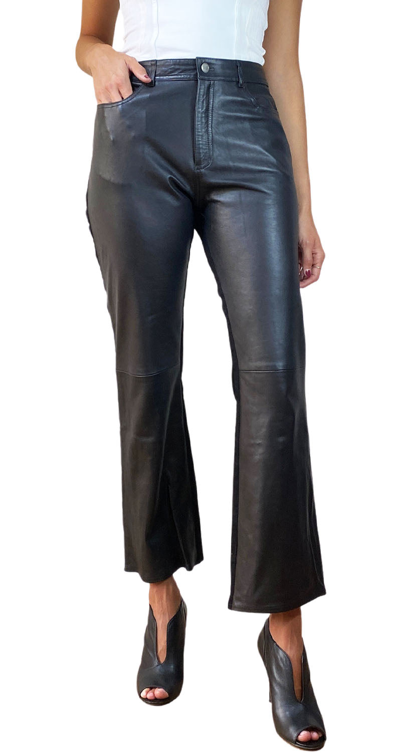 Pantalón Negro de cuero en delantero y denim trasero, modelo 5 bolsillos. Talla 44/3 de la marca.
