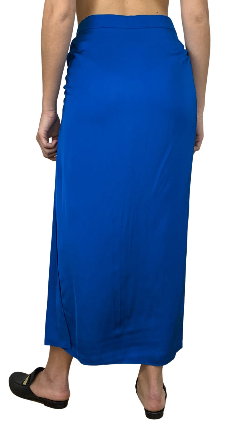 Pollera midi Azul con fruncidos y abertura delantera. Tiene pequeños detalles en costuras.