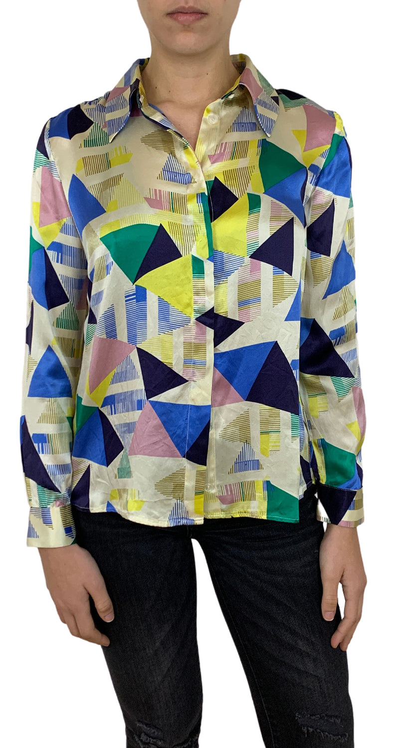 Blusa multicolor de Seda con estampado geométrico. Tiene botón decorativo en cuello y bajo redondeado. Tiene leve signos de uso y pequeña imperfección en costuras traseras.