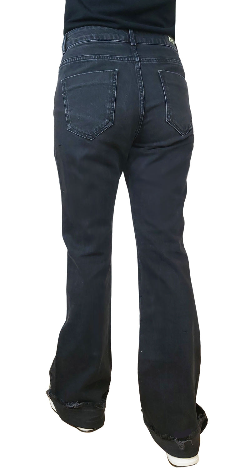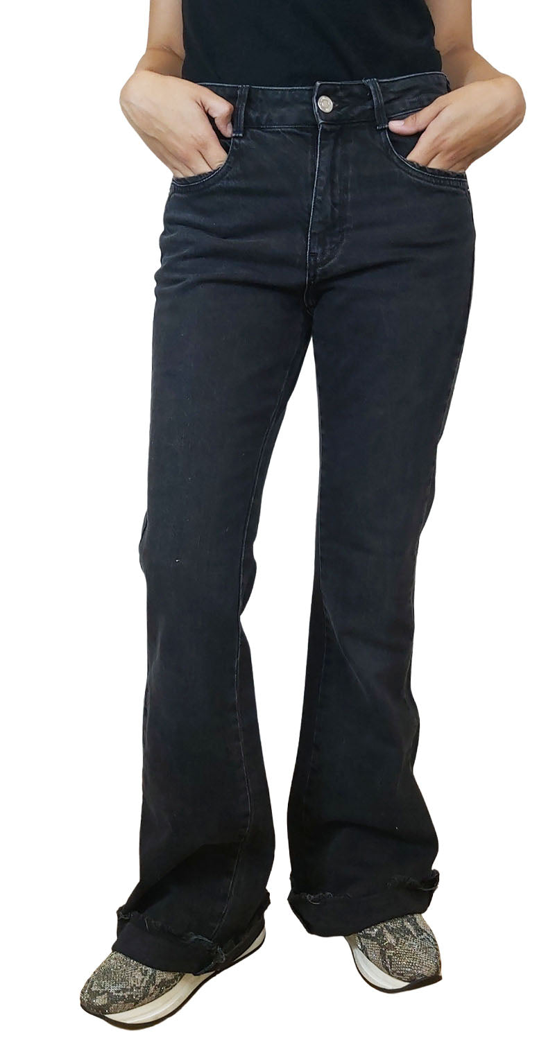Pantalón tiro alto Denim color Negro, con amplitud en el ruedo.