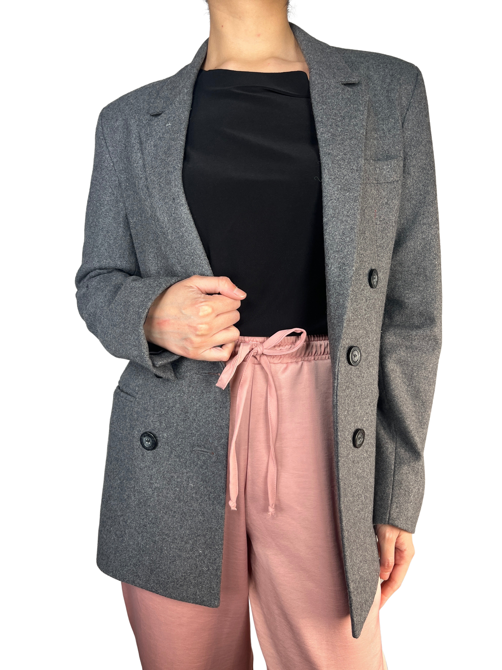 Blazer de lana Gris con tres botones delanteros y bolsillos con tapeta.
