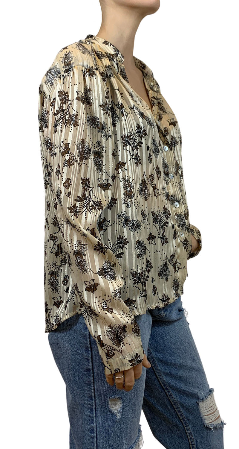 Blusa manga larga multicolor de cuello mao con detalles de lurex y estampado motivo floral.