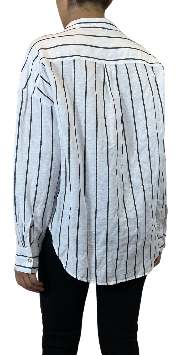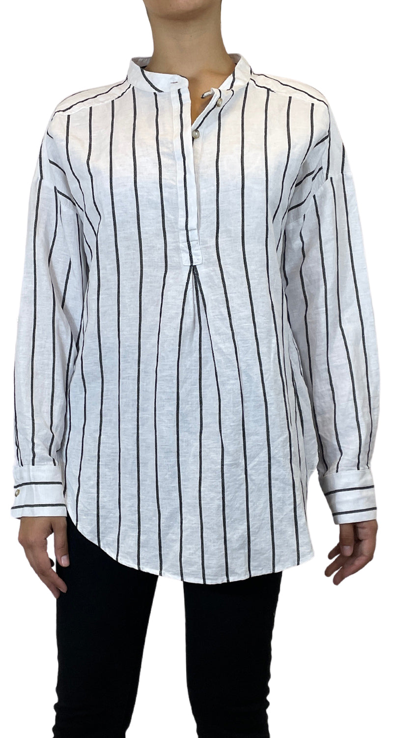 Blusa manga larga a rayas en color Blanco y Negro, cuello mao, 4 botones en delantero.