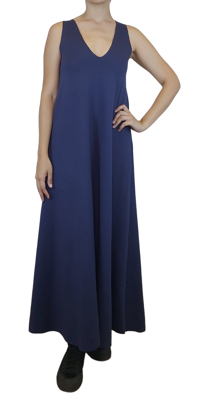 Vestido maxi color Navy sin mangas con escote en V en delantero y espalda.