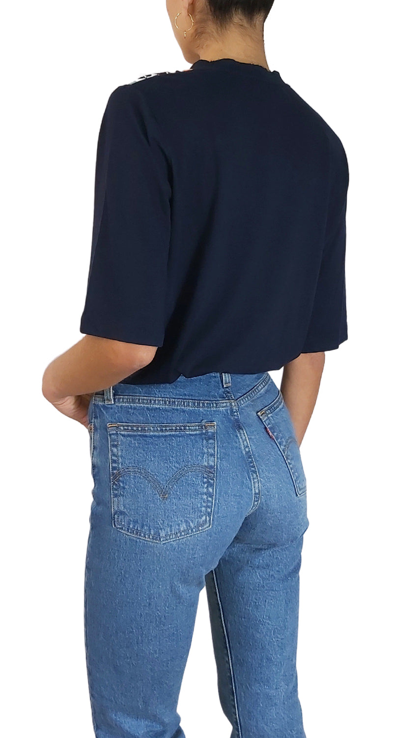 Blusa con cuello rendod, con diseño de flores Multicolor, con mangas de algodón, con leves signos de uso.