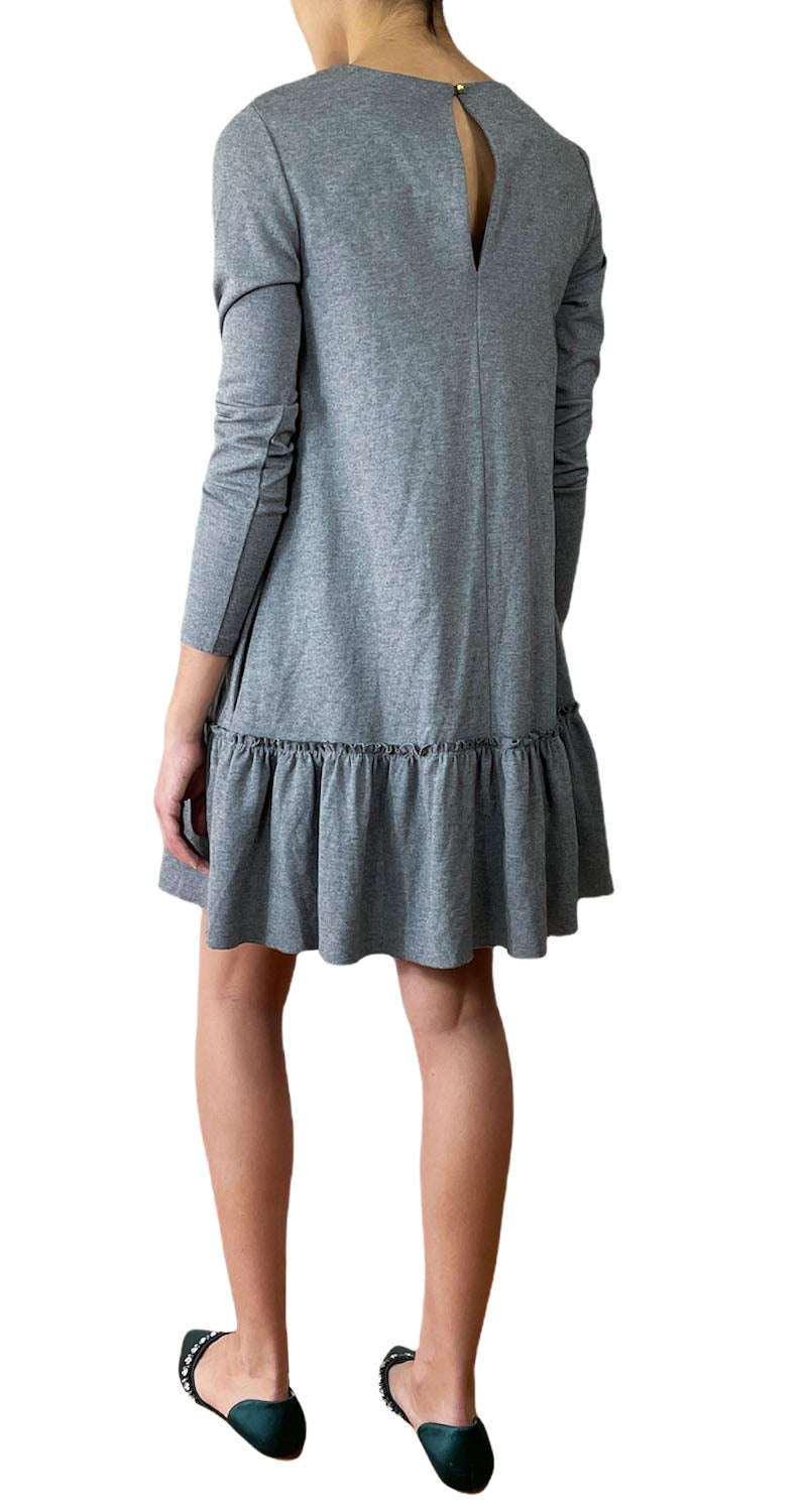 Vestido corto manga larga color Gris con vuelo en ruedo. Talla 1 de la marca.