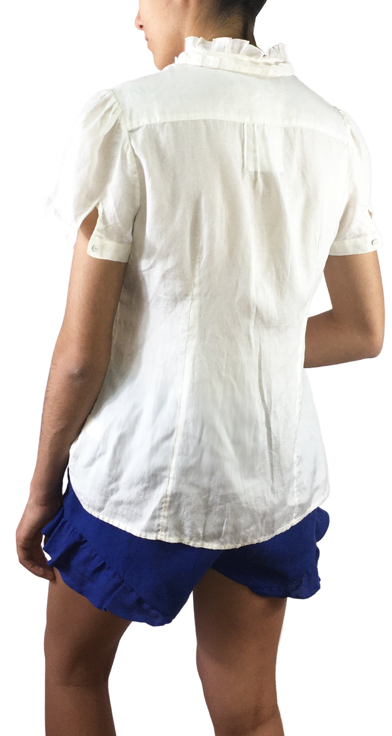 Blusa manga corta color Blanco con vuelos en cuello y tapeta frontal.