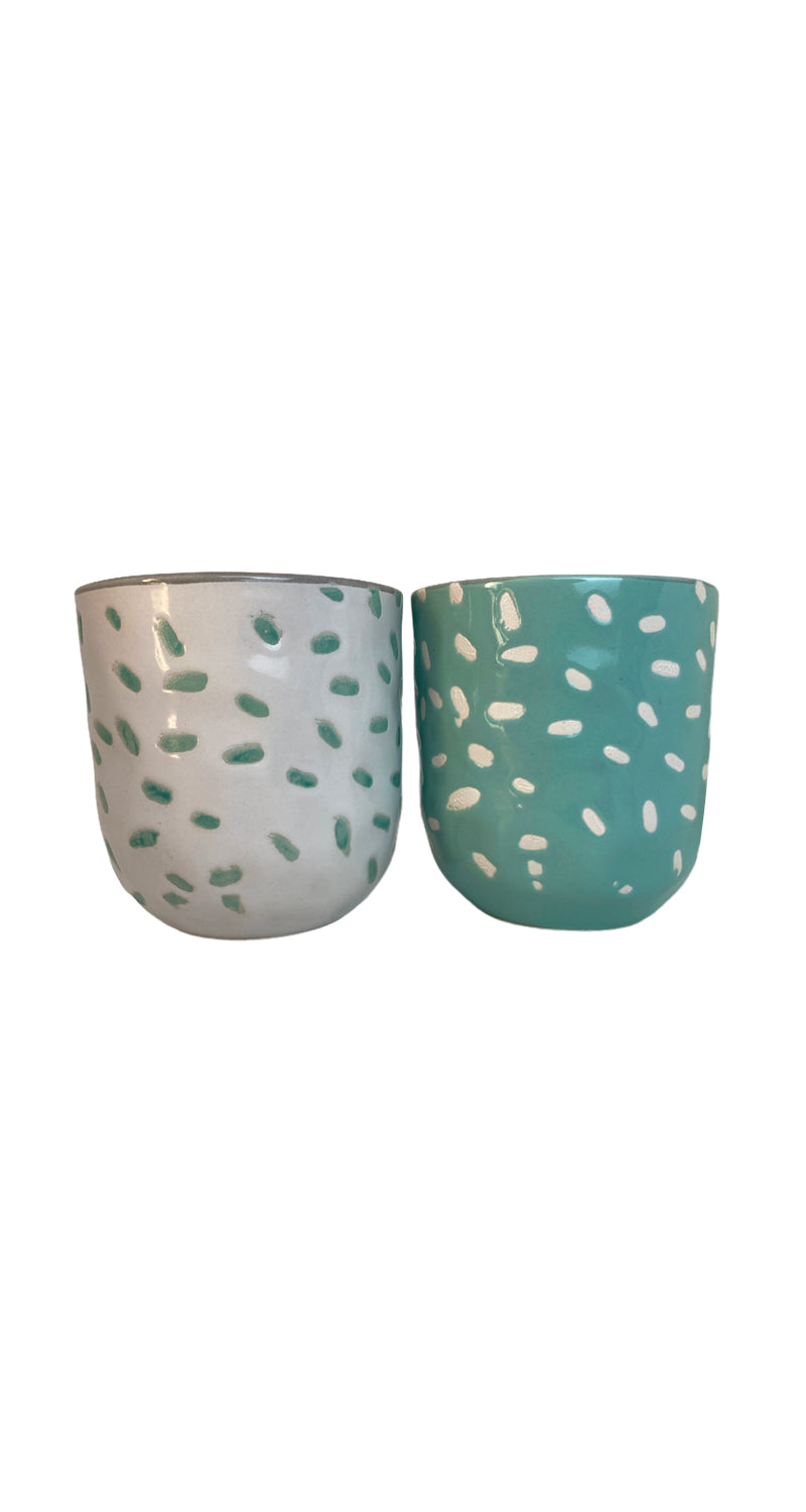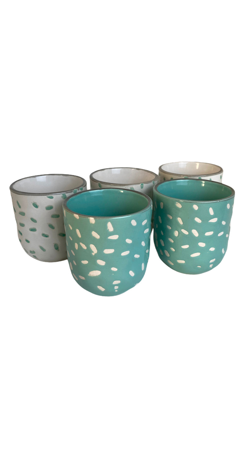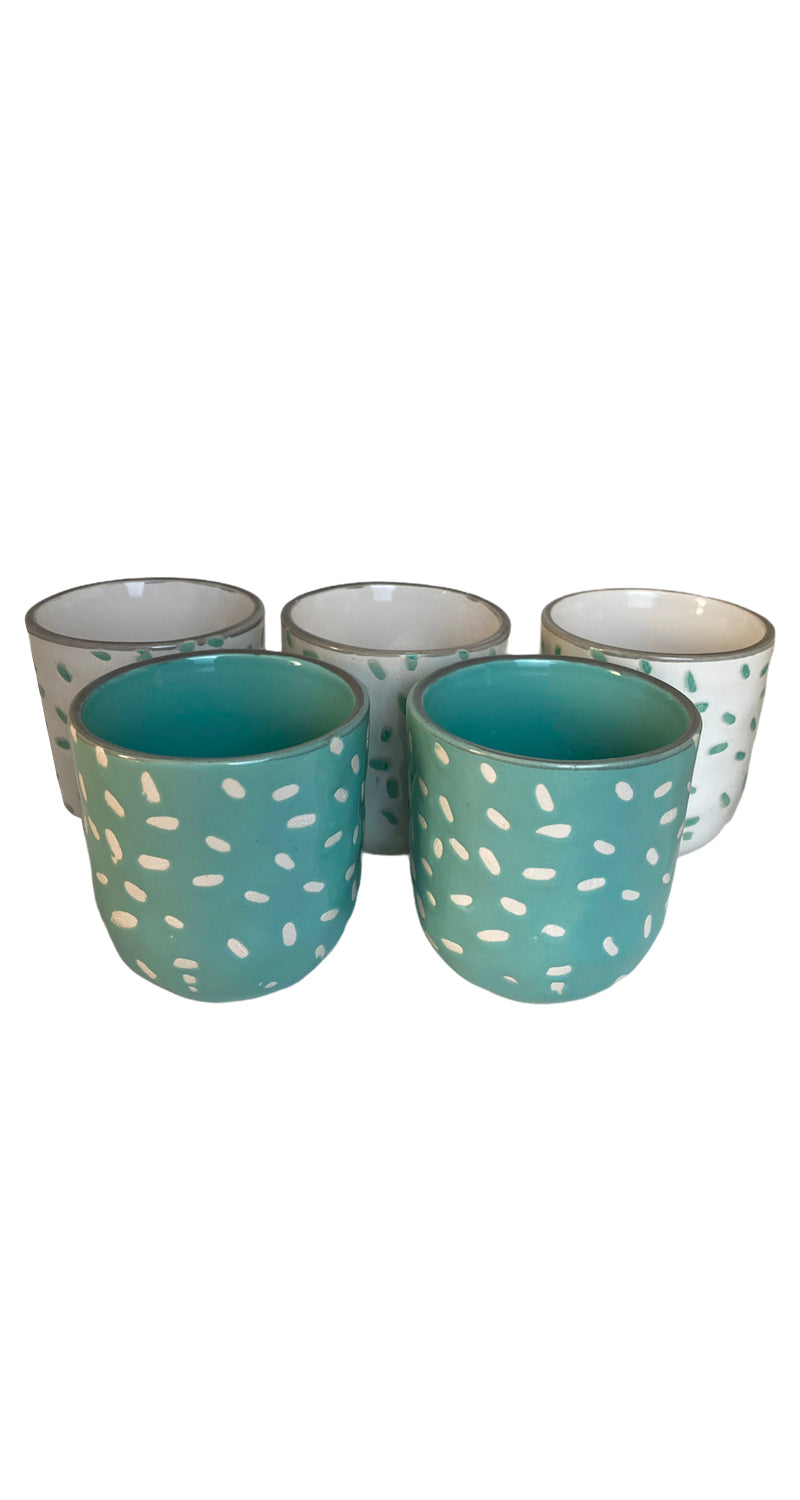 Set de cinco vasos de cerámica, tres blancos con pintas celestes y dos celestes con pintas blancas.