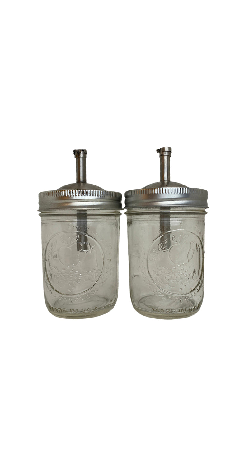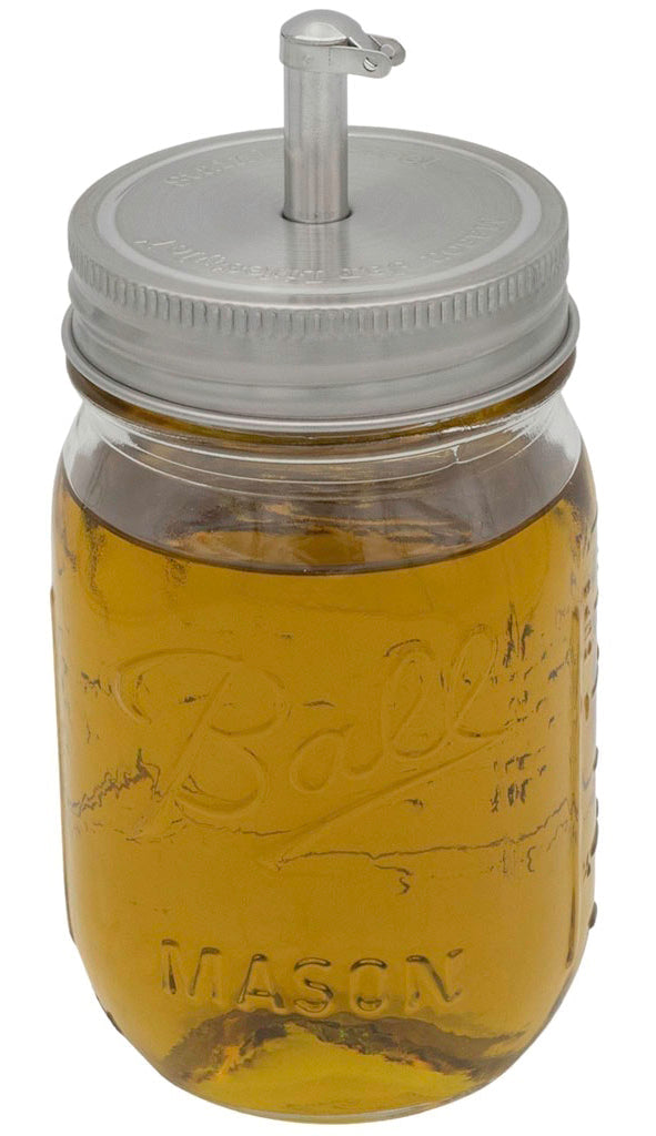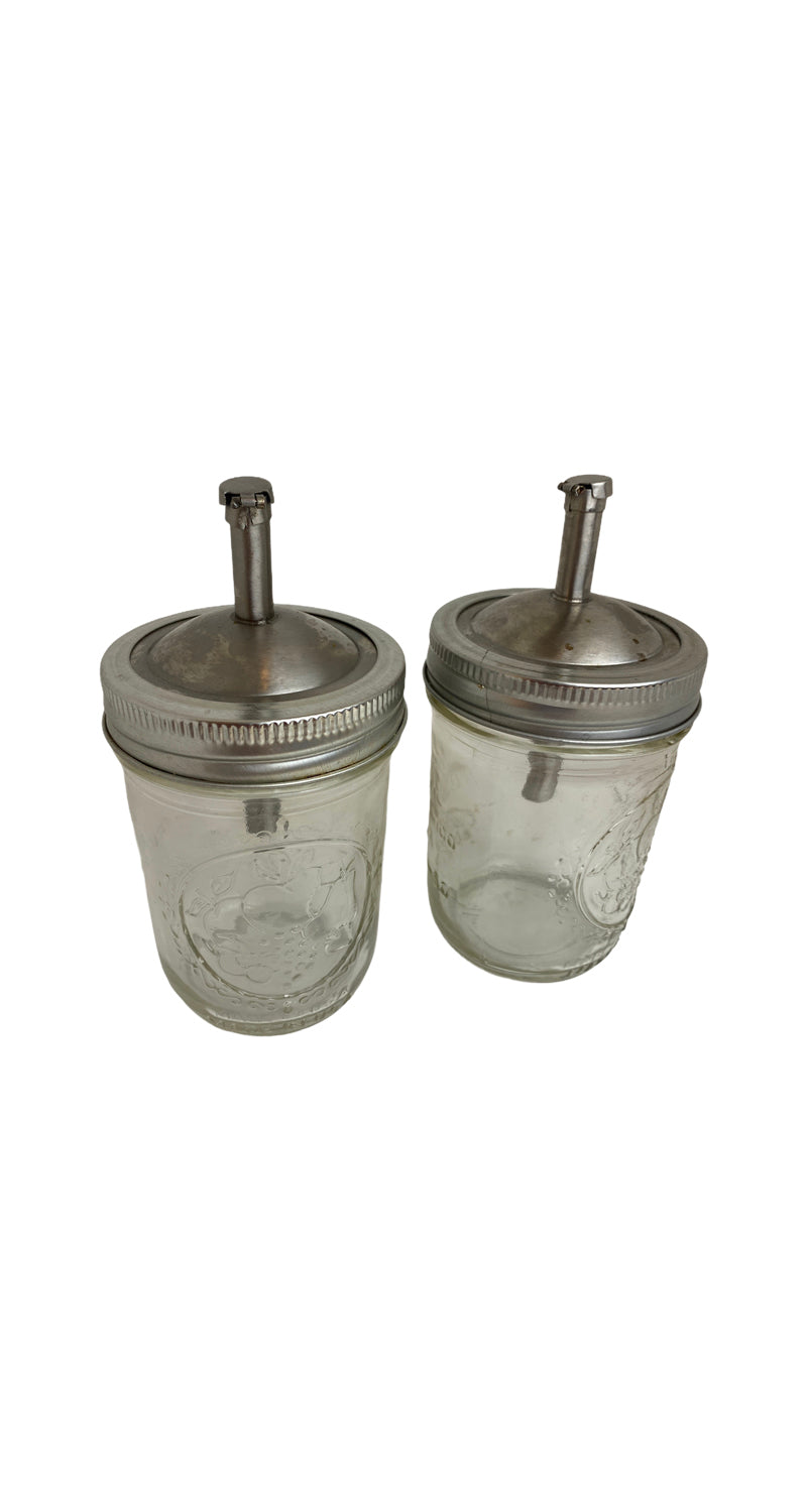 Dispensador de vidrio con tapa de metal con seguro, para aceite y vinagre.