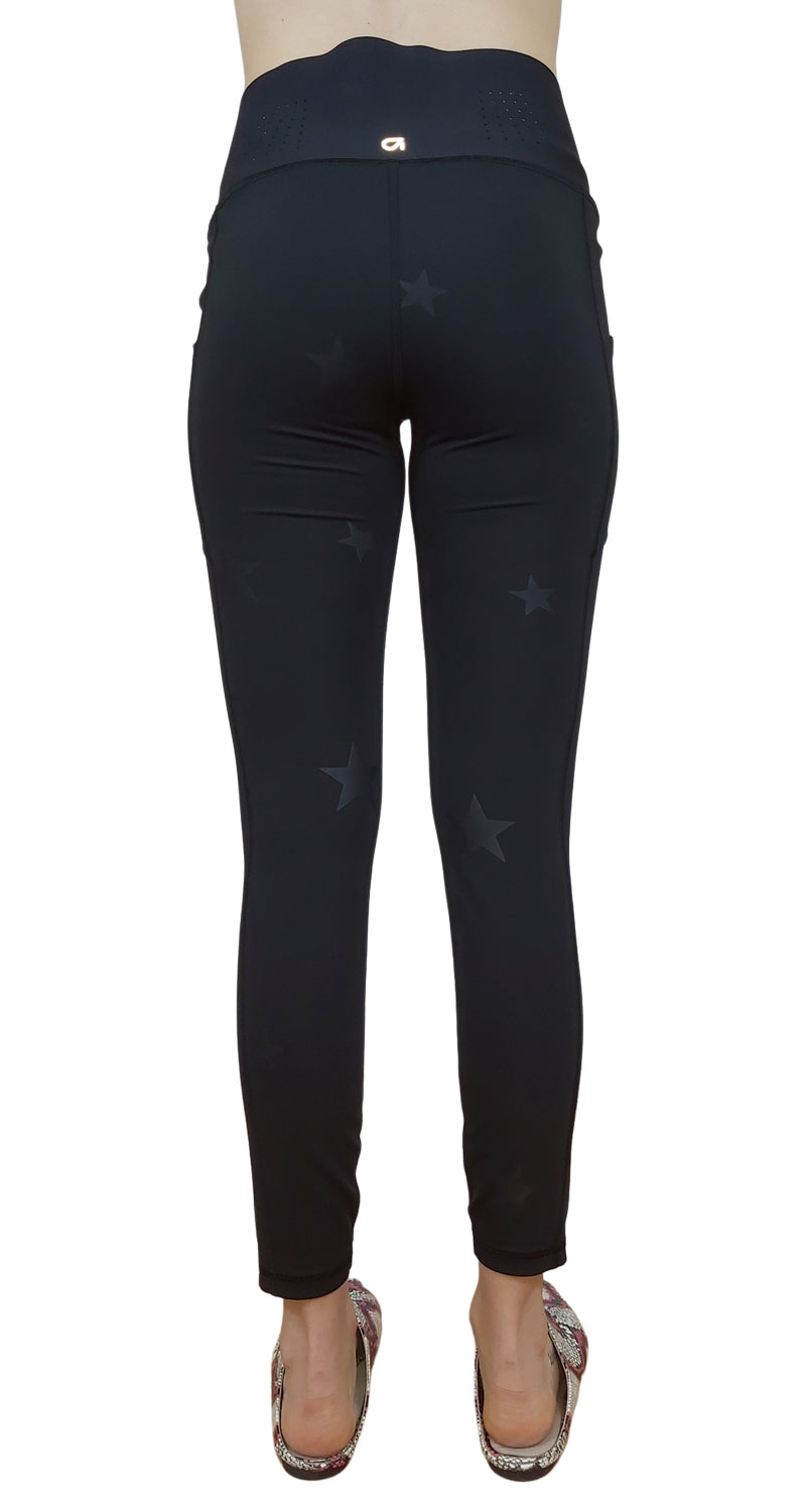 Leggings color Negro con detalles de estrellas, pretina alta y costuras visibles en costados.