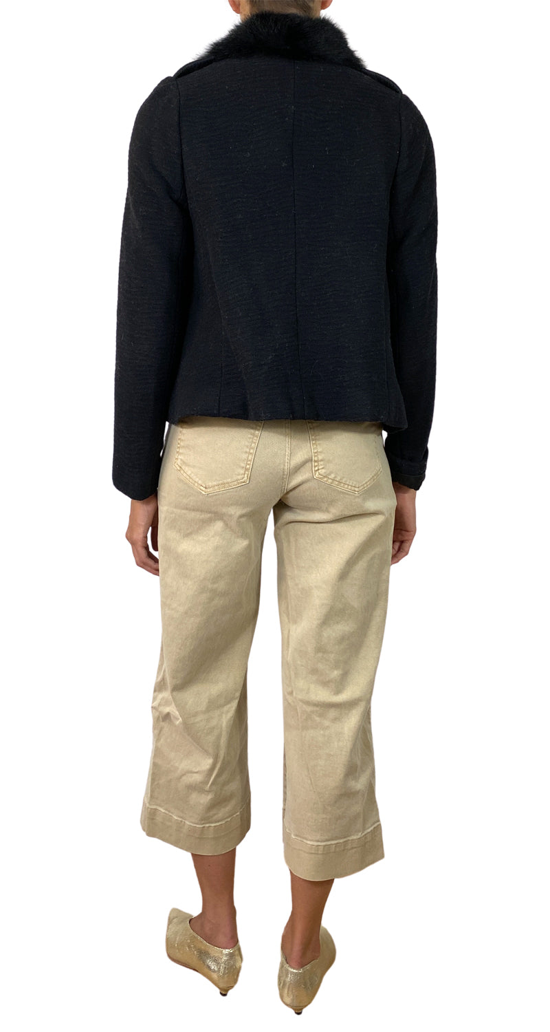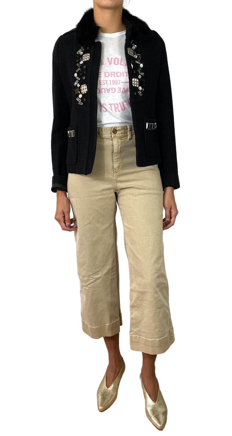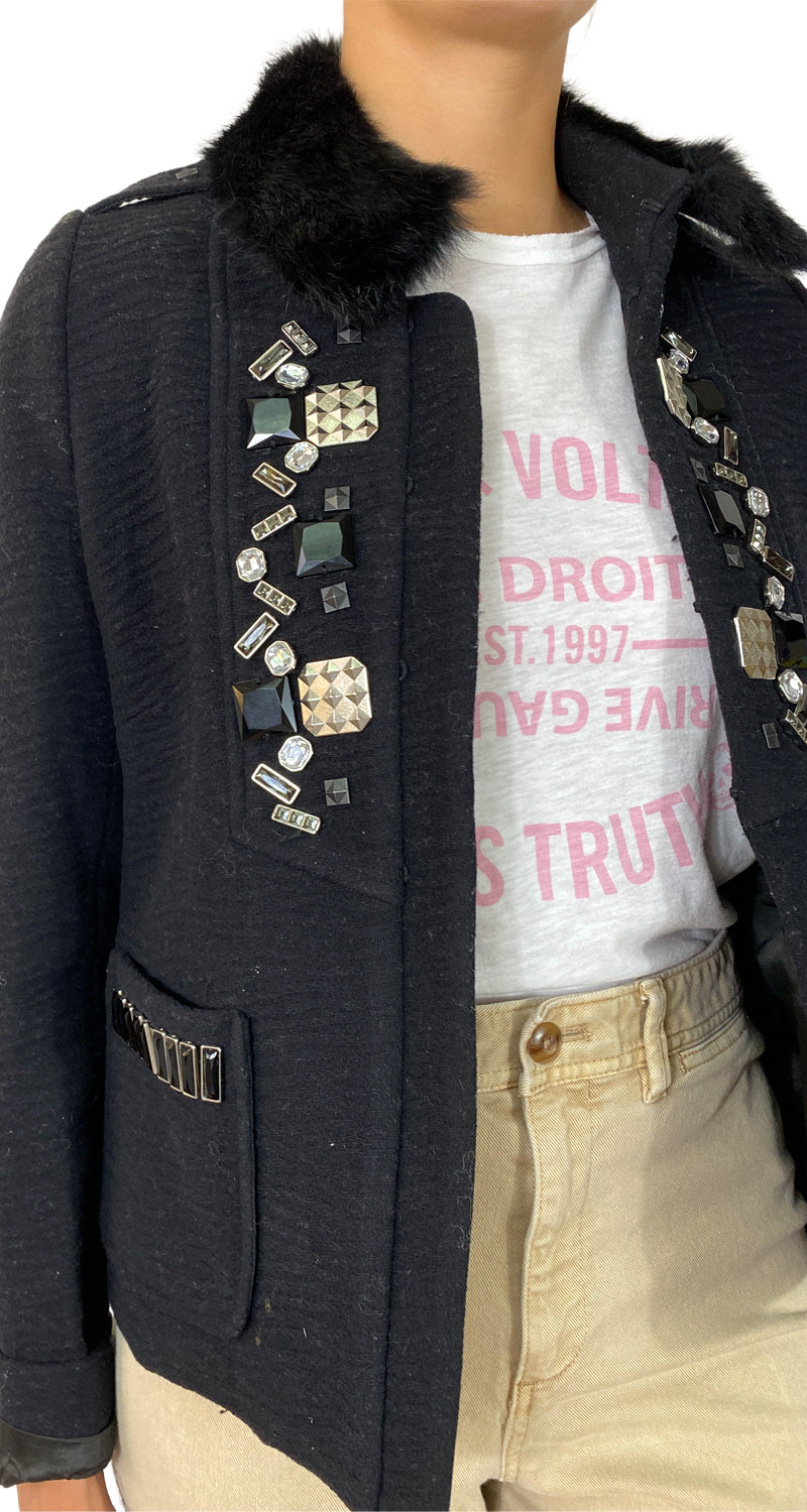 Chaqueta Negra con cuello de pelos y piedras en delantero.