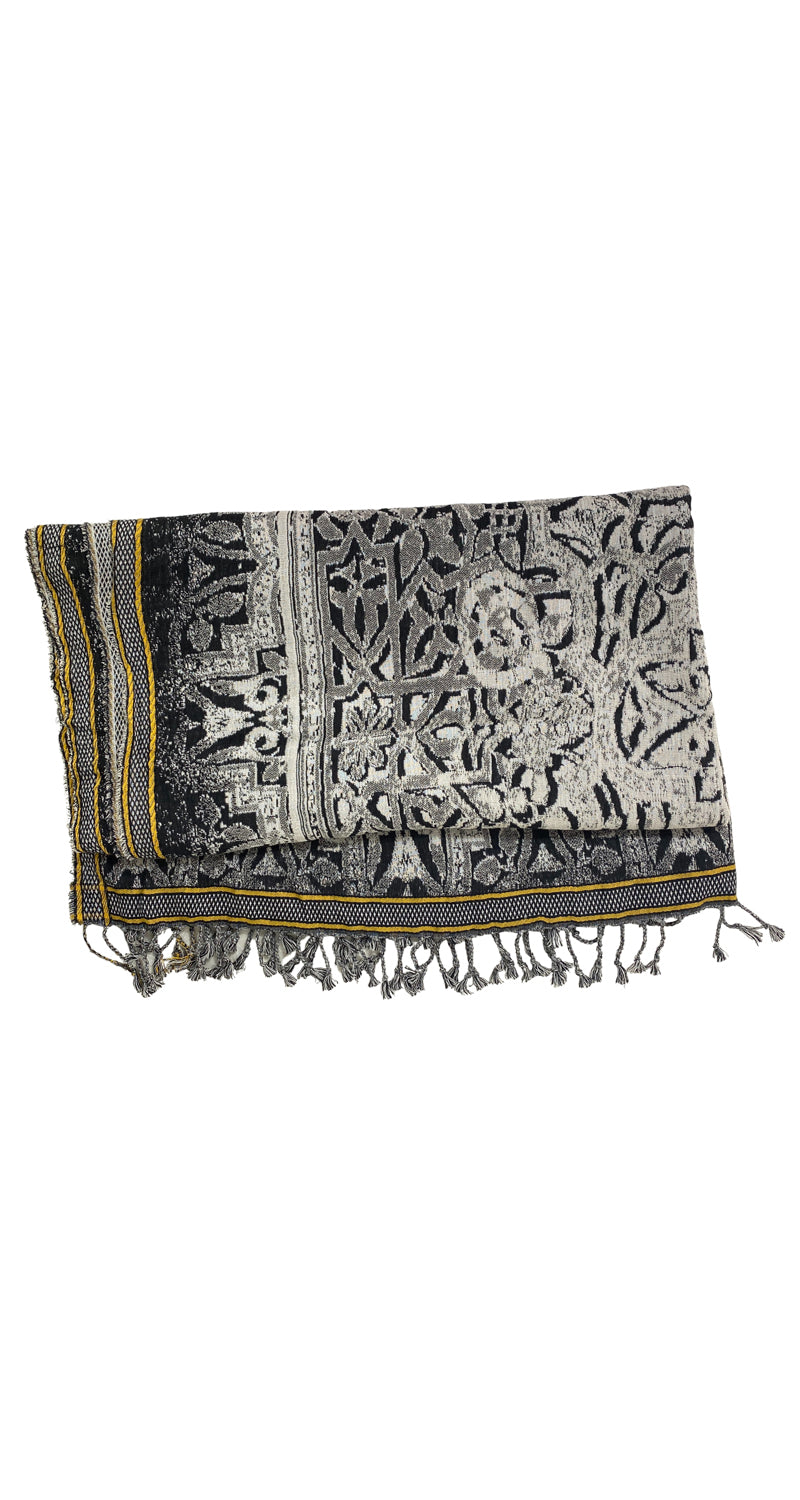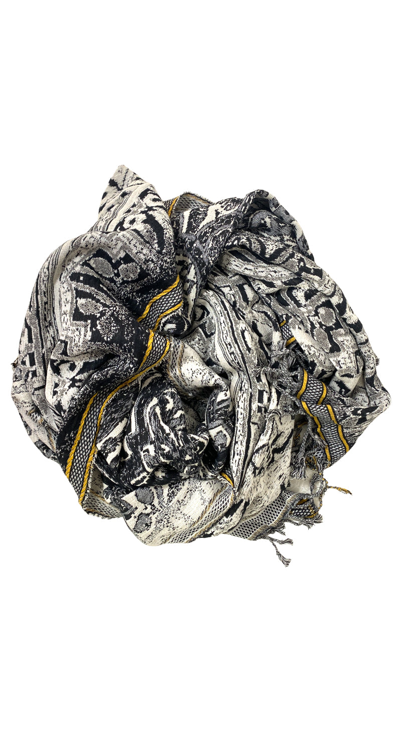 Pañuelo maxi Blanco y Negro con flecos. Detalles en amarillo. Medidas 195 x 107 cm.