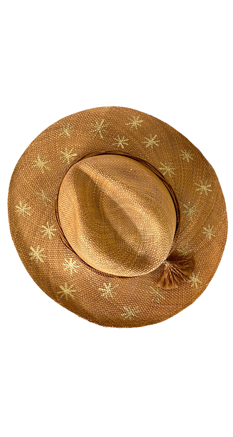 Sombrero Café con cuerdas en banda y destellos Dorados en ala.
