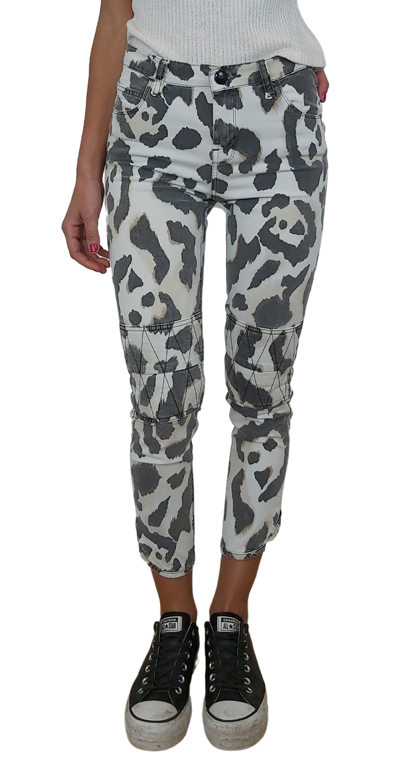 Pantalón Denim con estampado Animal Print color Blanco, Gris y Café, tiene detalle quilt en rodillas. Tiene signos de uso que desaparecen con lavado.