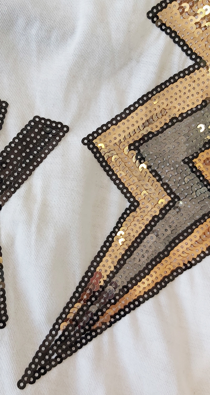 Polera color Blanco manga corta con frase Rock y Rayo en lentejuelas.
