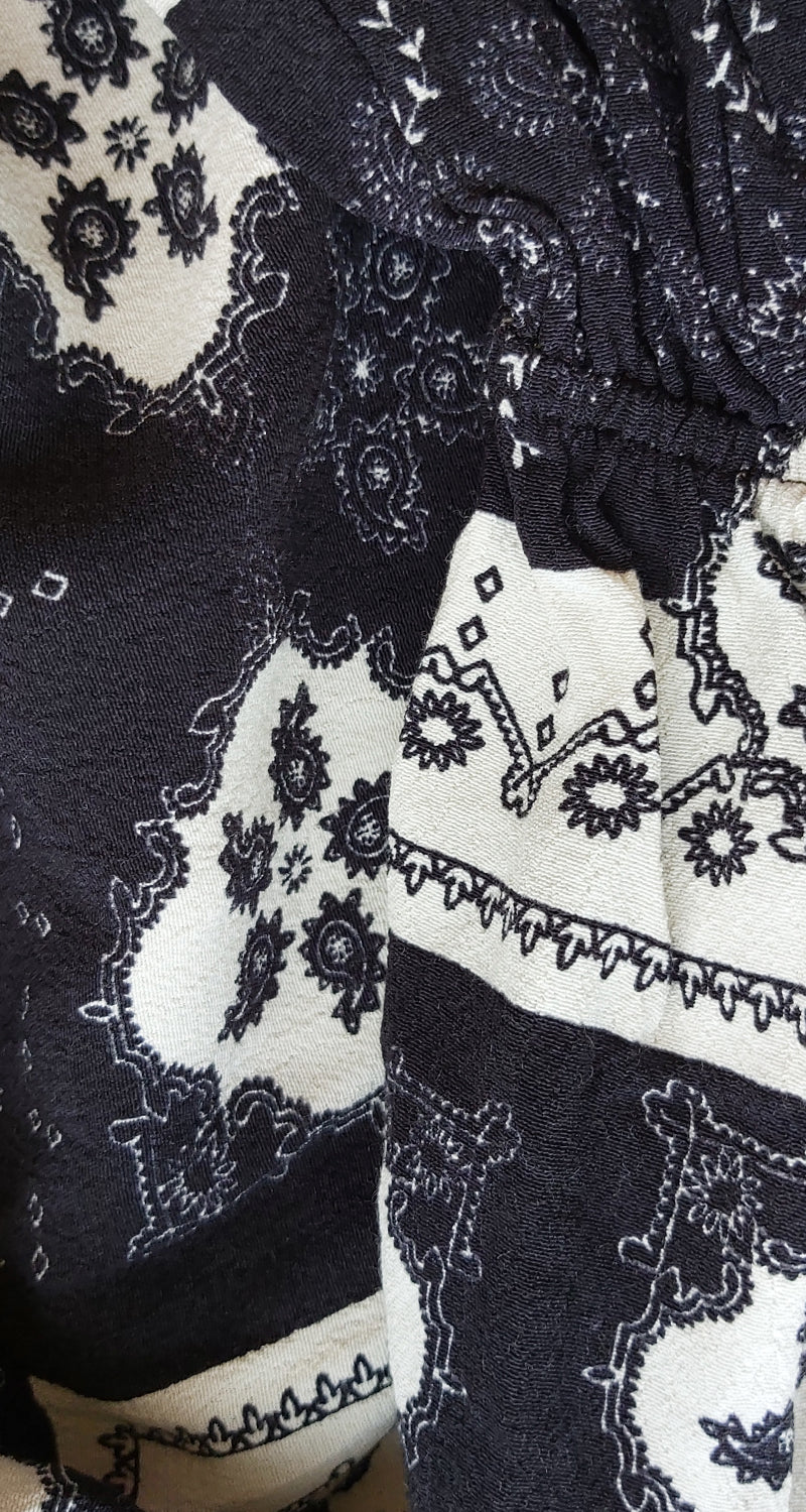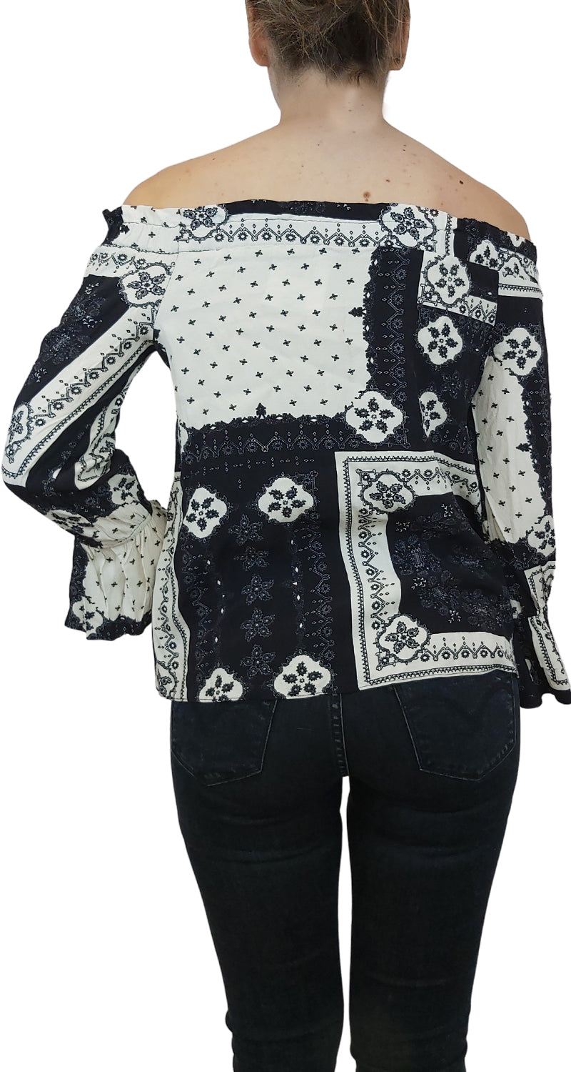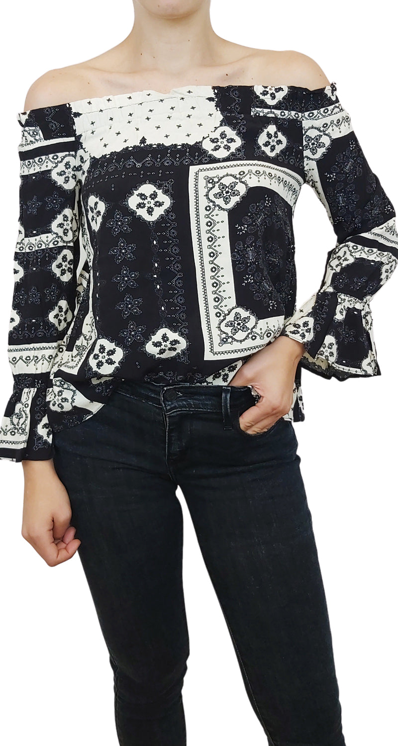 Blusa manga larga con escote mostrando hombros, estampado Paisley en tonos Blanco y Negro.