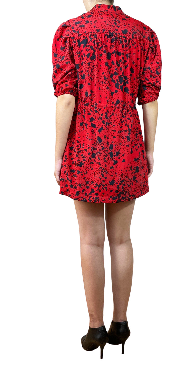 Vestido color Rojo con estampado Negro y detalles de vuelo en delantero.