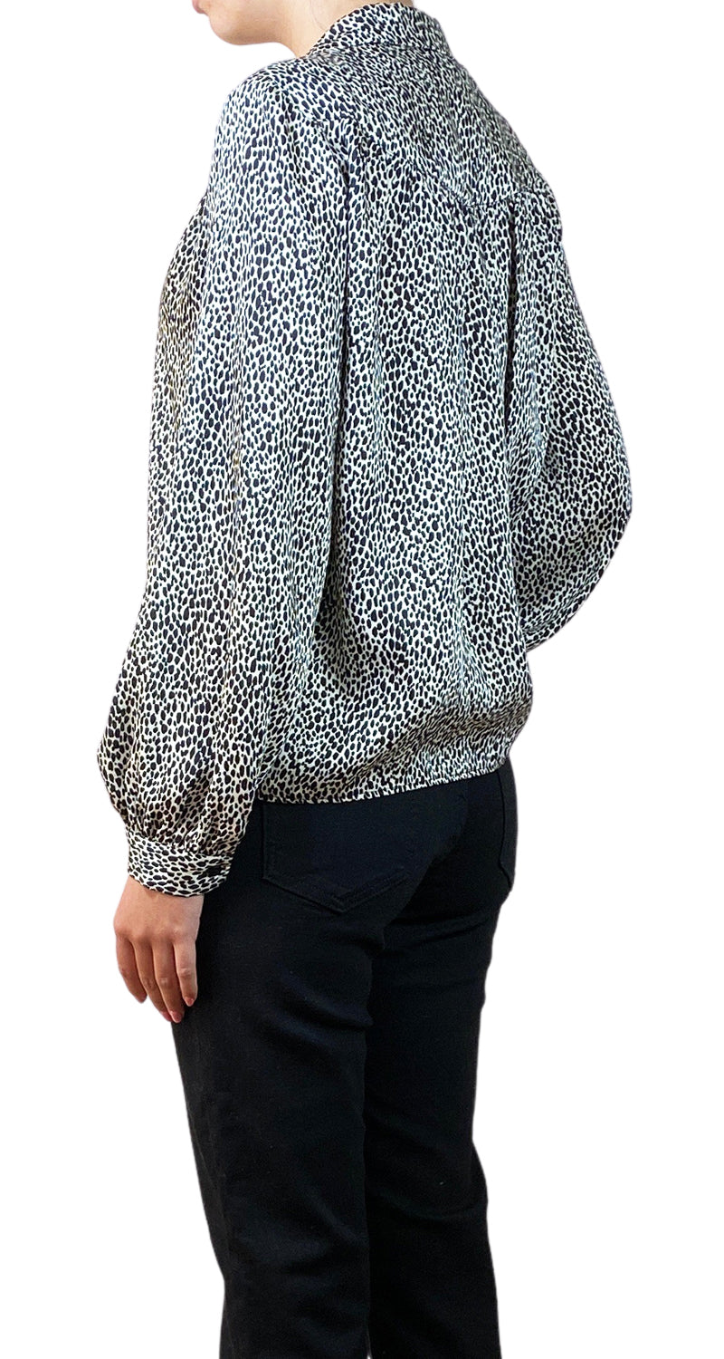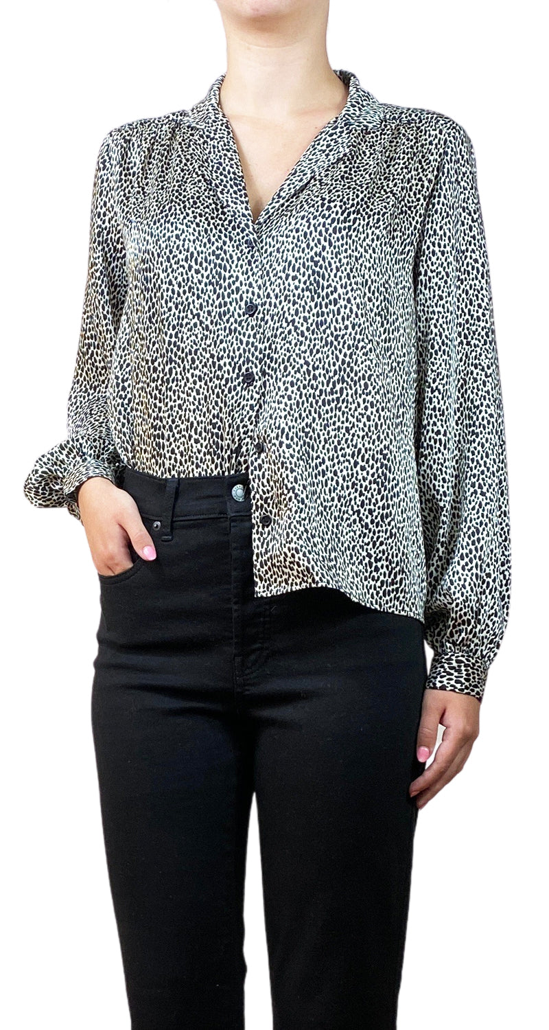 Blusa color Blanco con estampado de puntos Negros y botones en delantero.