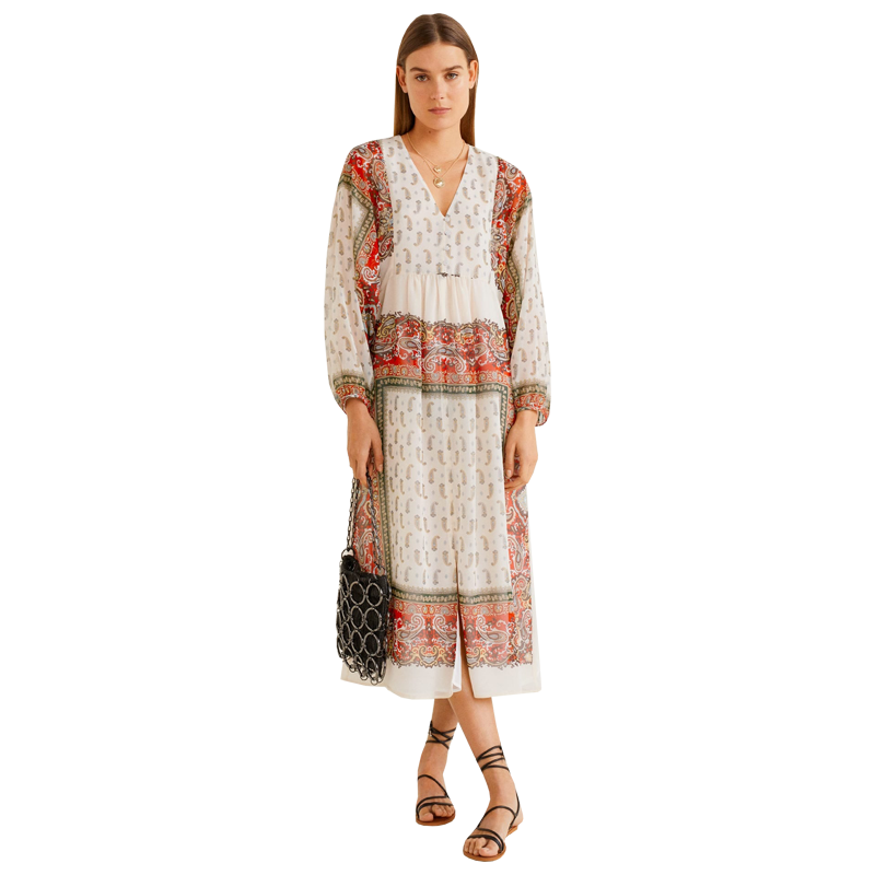 Vestido maxi de tejido fluido, diseño acampanado. Escote V y mangas largas abullonadas. Cierre de botones en la parte delantera.