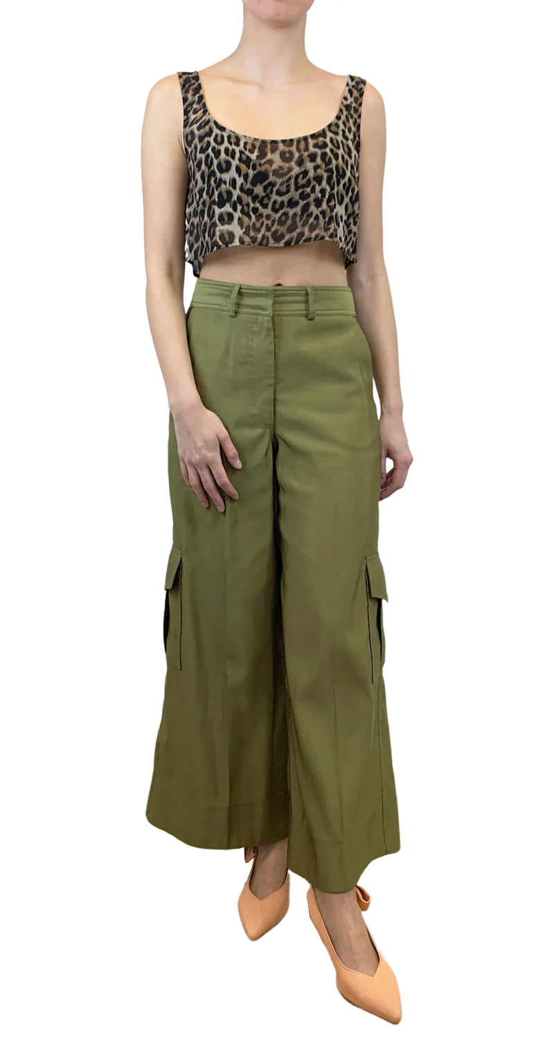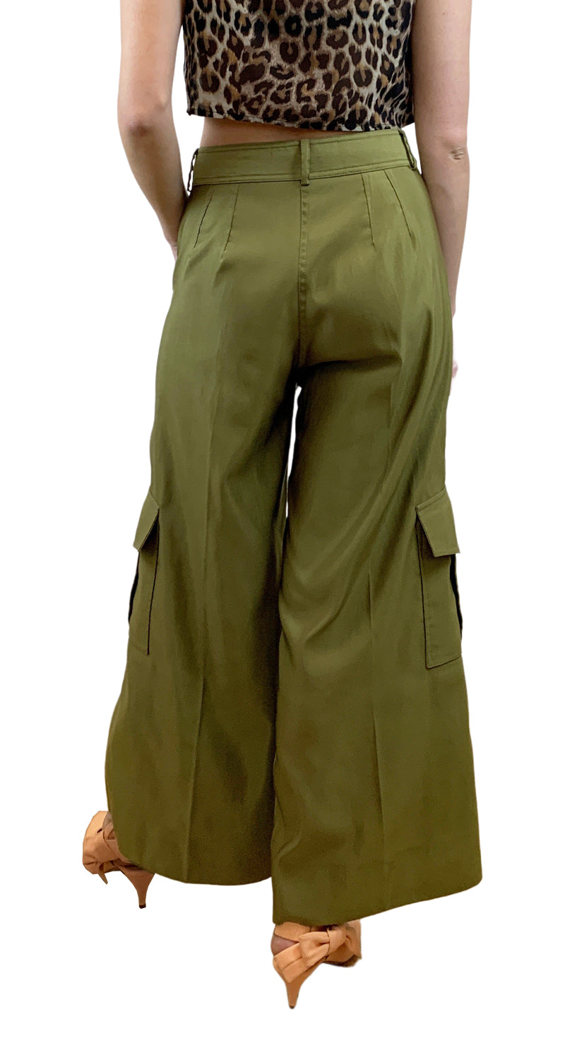 Pantalón Palazzo color Verde con bolsillo en ambos lados externos a la altura de la rodilla. Talla 46/4 de la marca.
