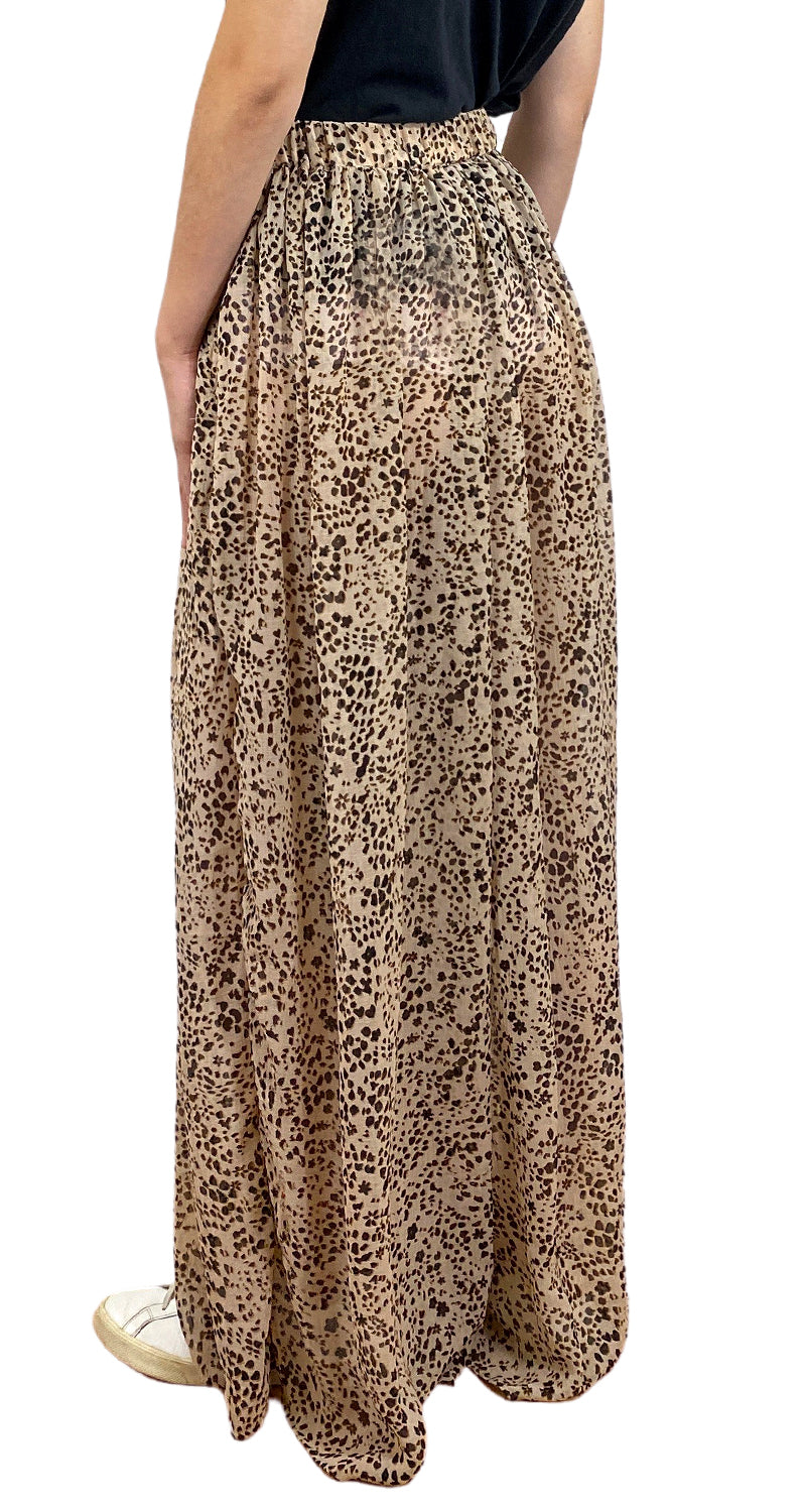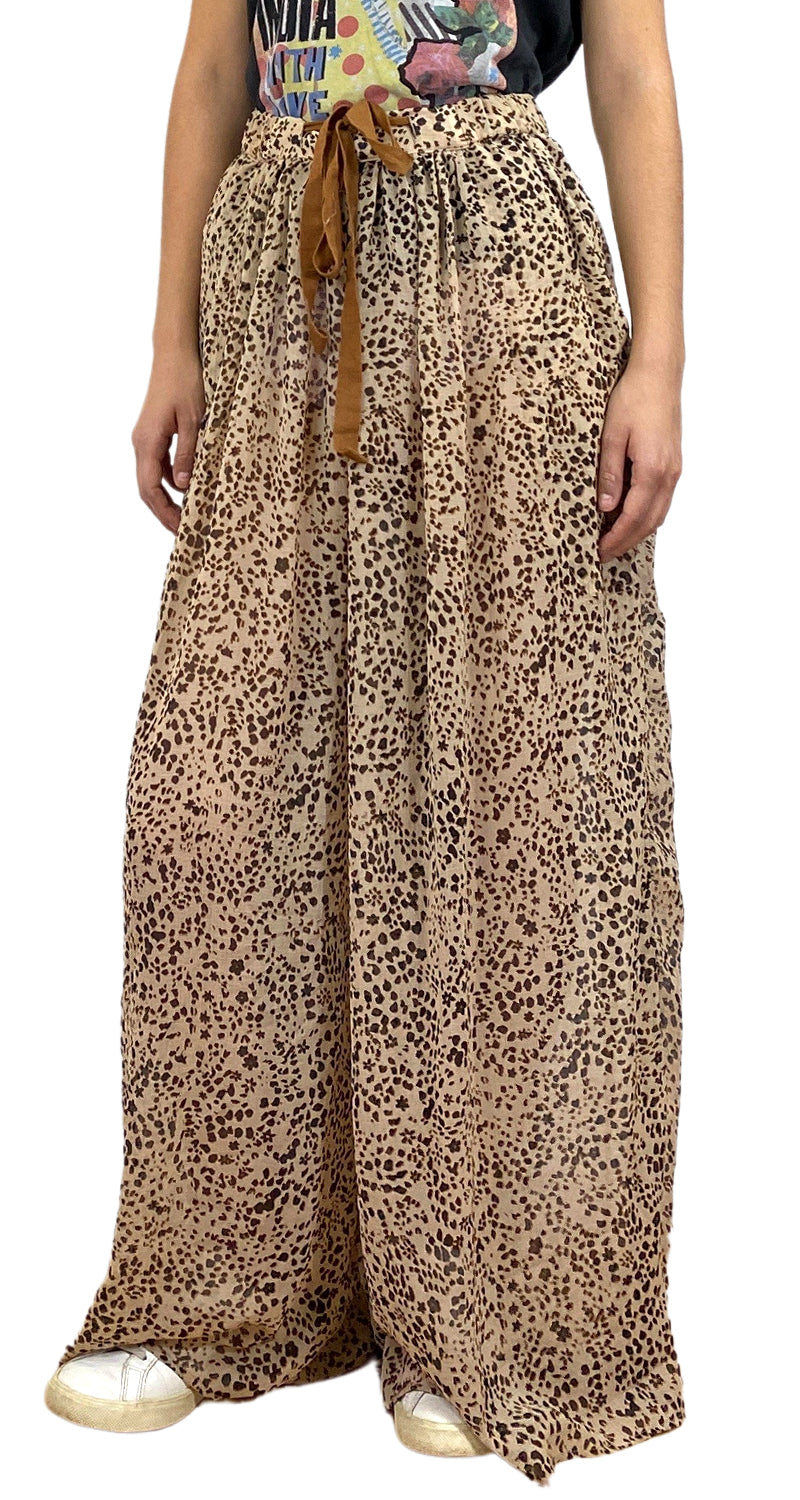 Pantalón traslucido con estampado Animal Print, bolsillos en laterales y cintura con elástica y lazo, piernas anchas.