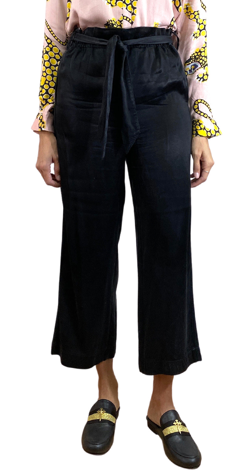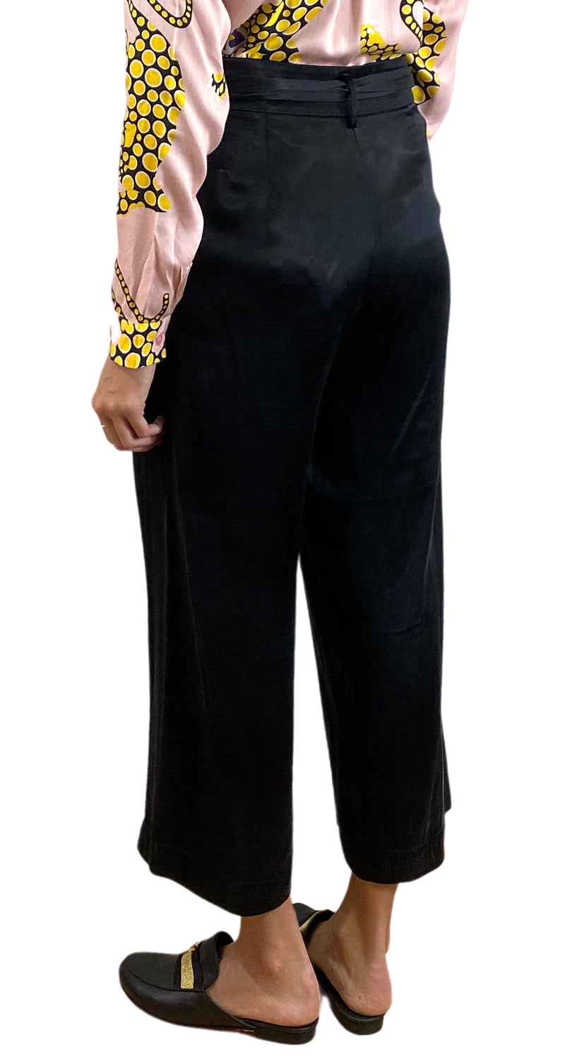 Pantalón color Negro Satinado con pretina elasticada, vuelos y lazo, bolsillos laterales. Altura de modelo 1,71