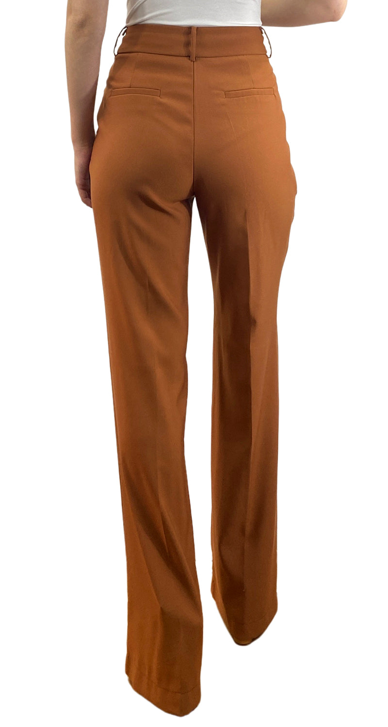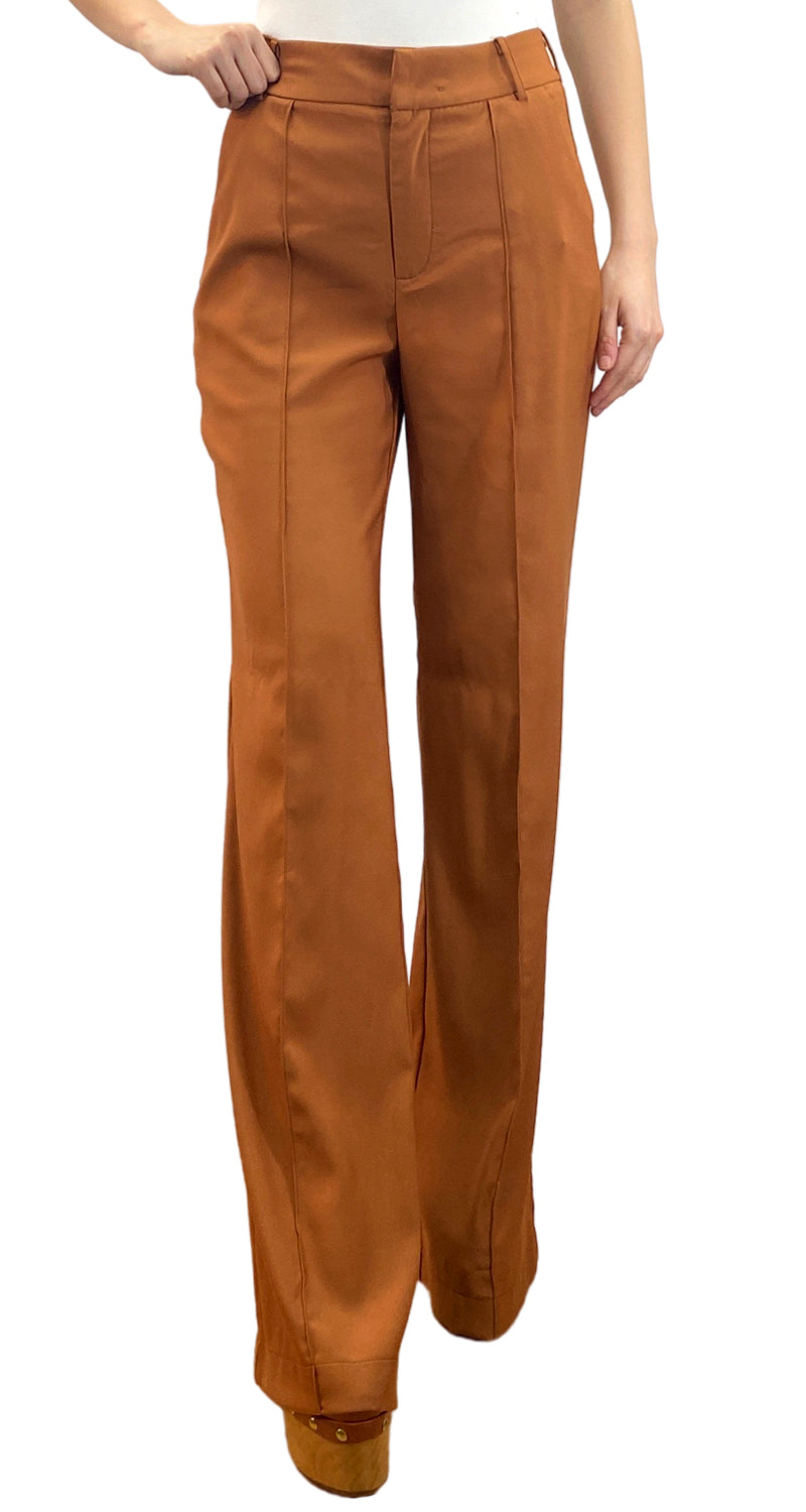 Pantalón color Café satinado, bolsillos laterales, cierre y broche en delantero. Altura de modelo 1,76
