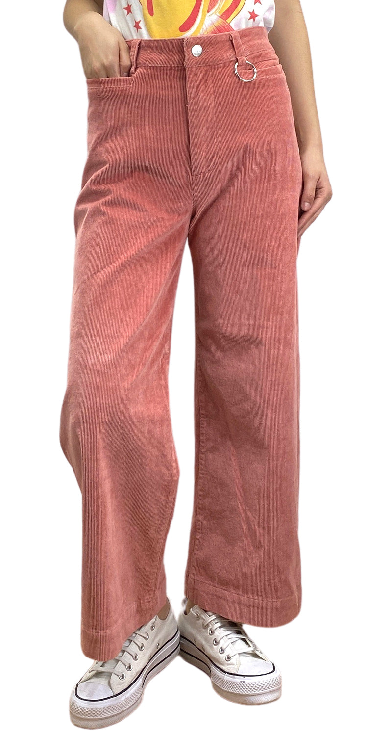 Pantalón Palazzo de cotelé en color Rosado, tiro alto con 4 bolsillos, cierre y botón en delantero. Altura de modelo 1,68