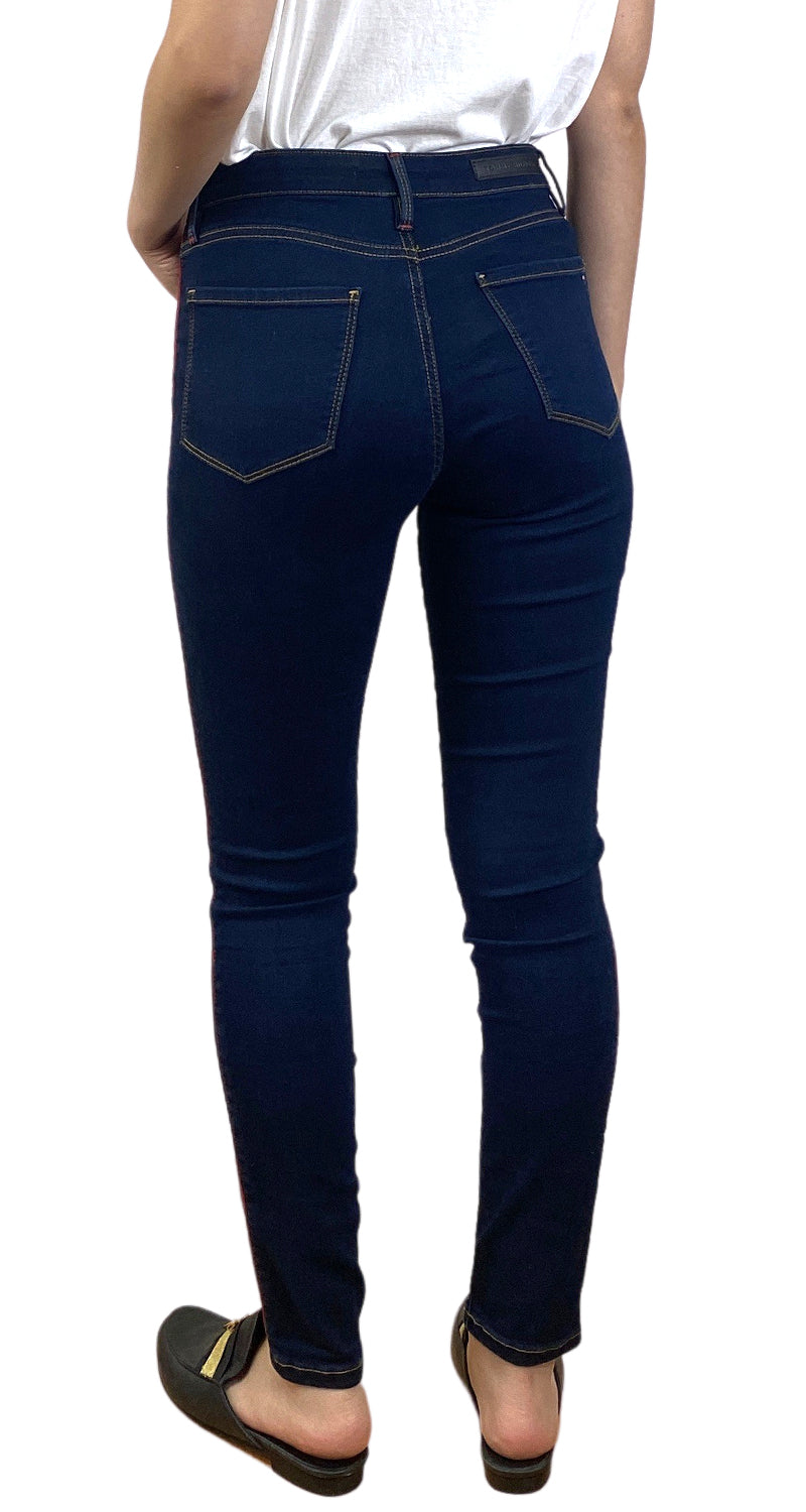 Pantalón Denim Azul Oscuro, modelo de 5 bolsillos con línea roja en laterales, Talla 28 de la marca. Altura de modelo 1,68