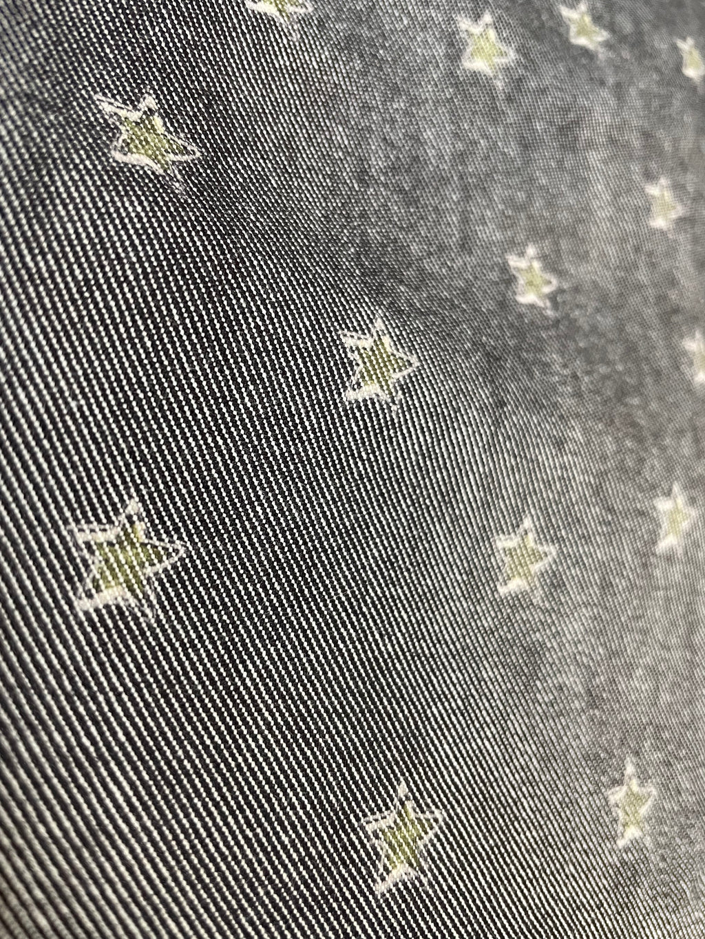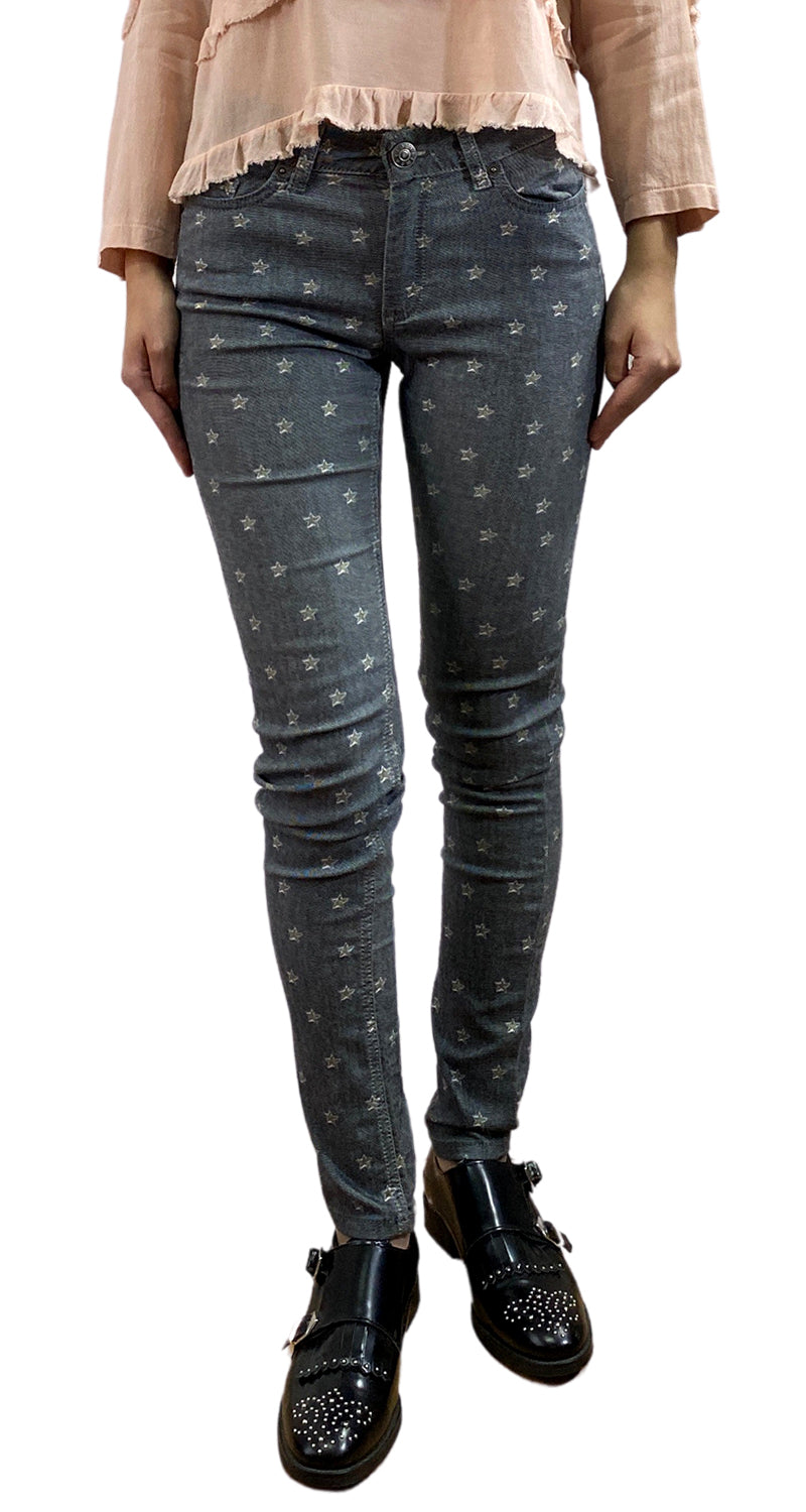 Pantalón Denim color Gris con estampado de estrellas, modelo de 5 bolsillos. Altura de modelo 1,76