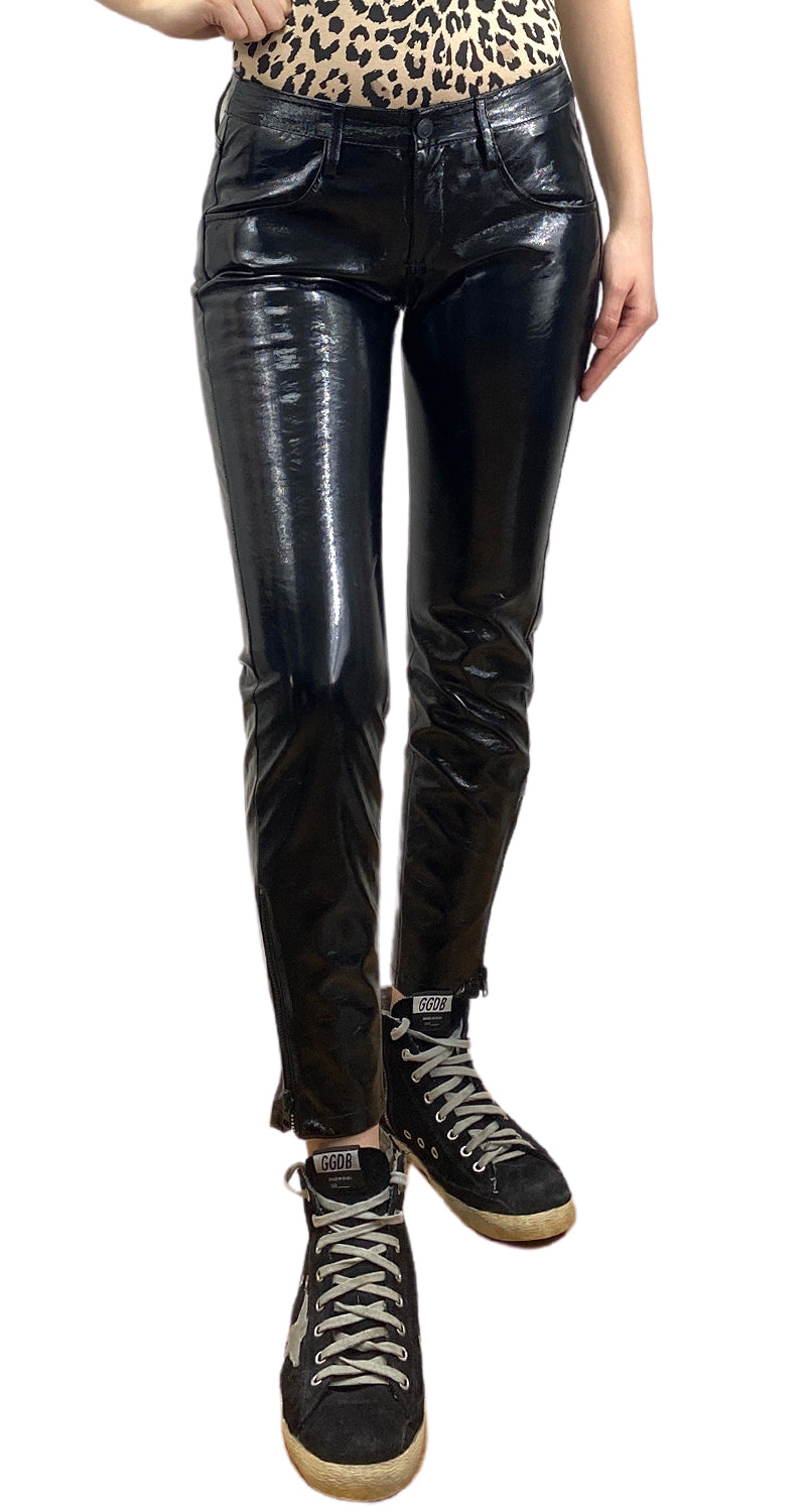 Pantalón color Negro de ecocuero estilo charol. Altura modelo 1.68.