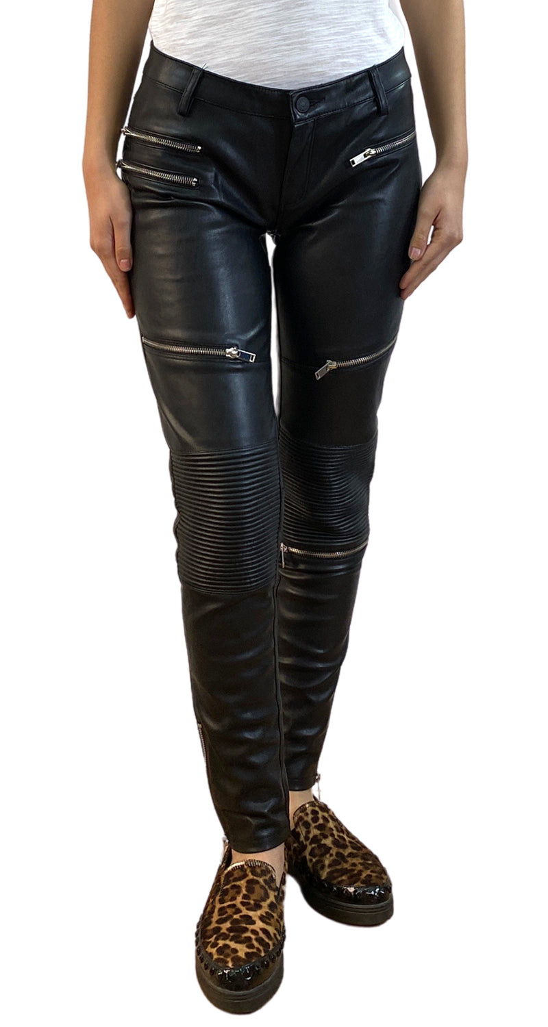 Pantalón de Ecocuero en color Negro con múltiples bolsillos con cierre en delantero y lateral inferior de pierna. Altura de modelo 1,68