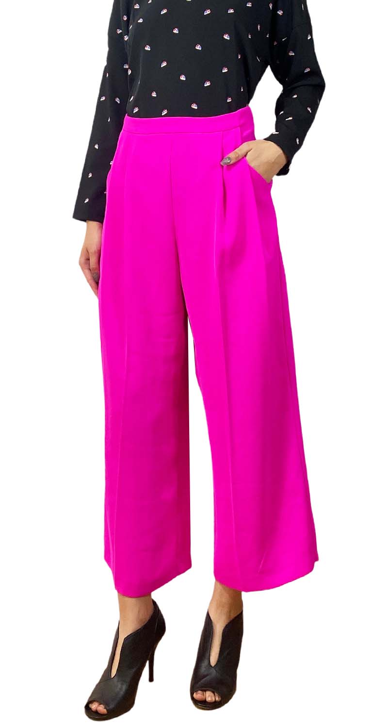 Pantalón de tela color Fucsia estilo palazzo, con bolsillos en delantero y diseño plisado.