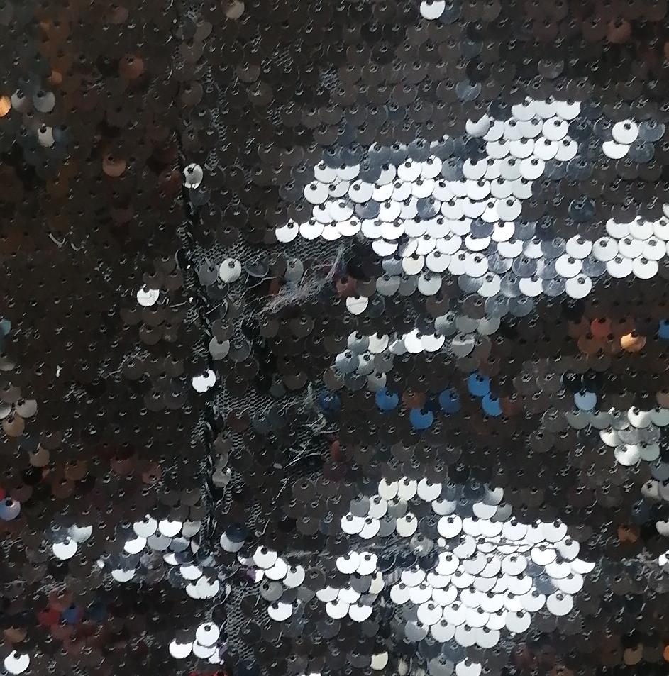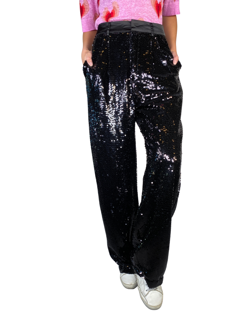 Altura de modelo 1,68. Presenta detalles en lentejuelas y puntos corridos en cintura.