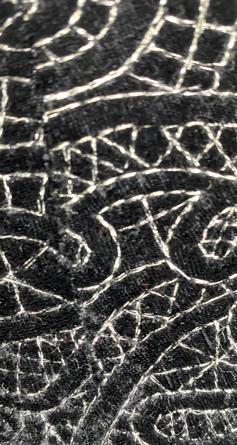 Pantalón color Negro de tela con bordado de fibras metalizadas y pretina elasticada. Altura modelo 1.68. El producto no especifica talla.