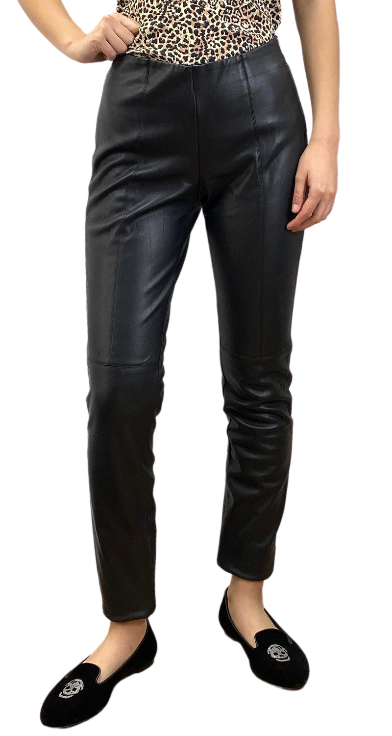 Pantalón color Negro de ecocuero con pretina elasticada. Altura modelo 1.68.