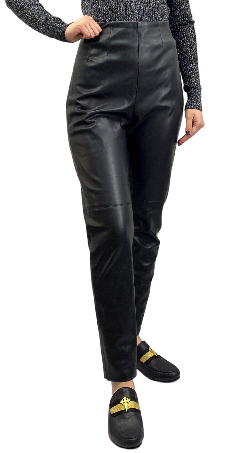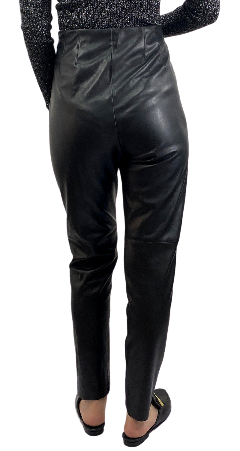 Pantalón color Negro de ecocuero con pretina elasticada. Altura modelo 1.68.