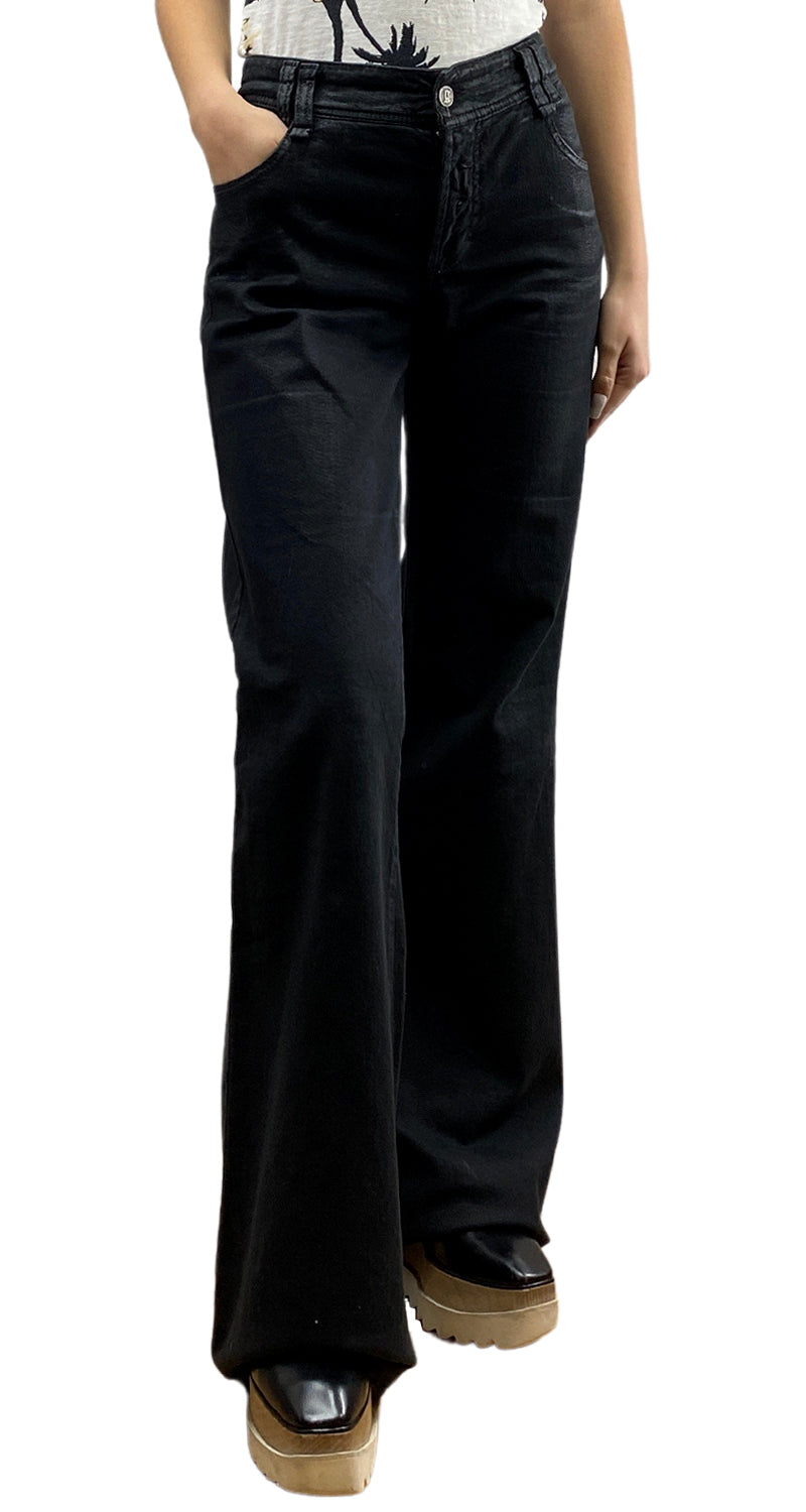 Pantalón Negro denim estillo palazzo modelo 5 bolsillos. Altura modelo 1.68. Talla 31 US de la marca.