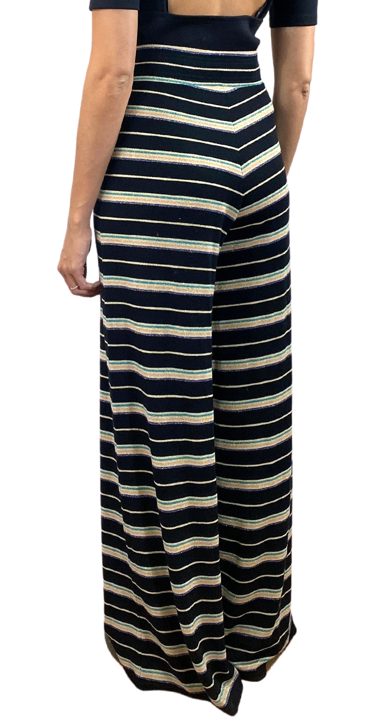 Pantalón estilo Palazzo en color Negro con rayas Multicolor con brillantes, pretina con elástica y lazo. Talla 2 de la marca. Altura de modelo 1,71.